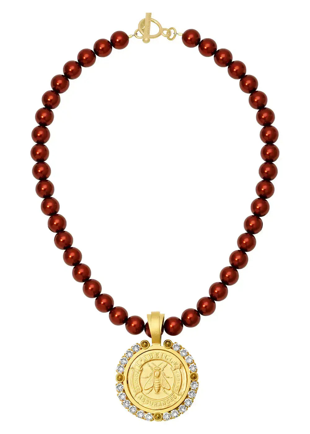 This necklace features a 17” strand of Ruby Crystal Pearls, finished with a Brilliante bezel and Abeille medallion. Can be worn alone or layered.
