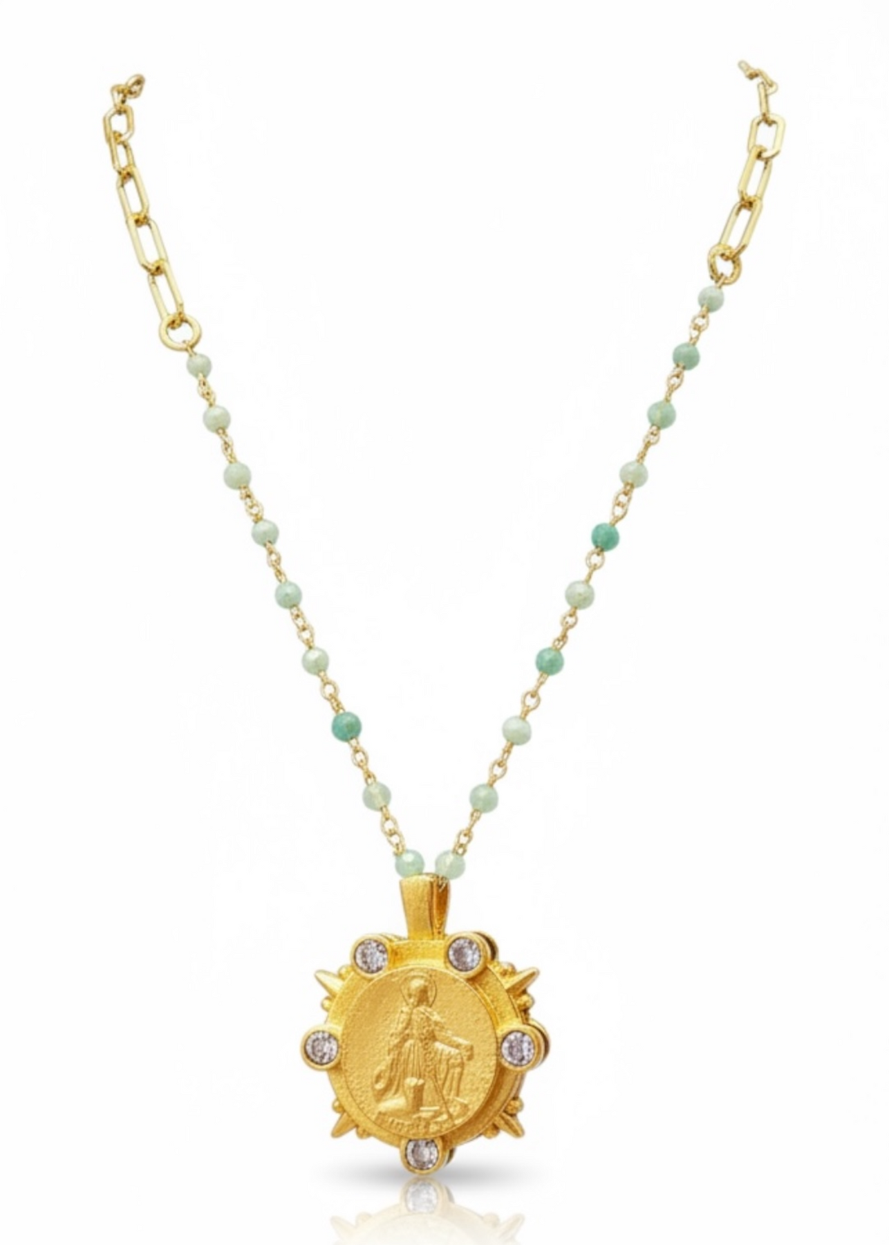 This necklace features a 17" micro peruvian opal and 24k plated Nantes chain with Marmonde bezel and St. Roch medallion and light sapphire cabs
