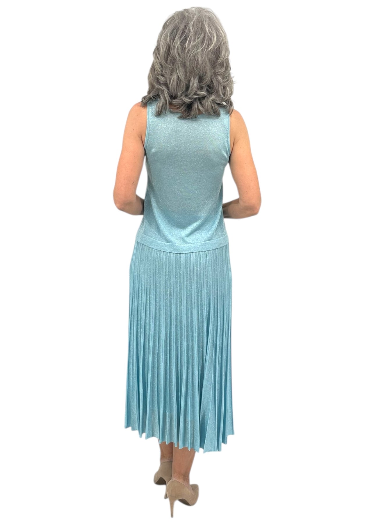 Pairs with matching tank and pleated skirt.