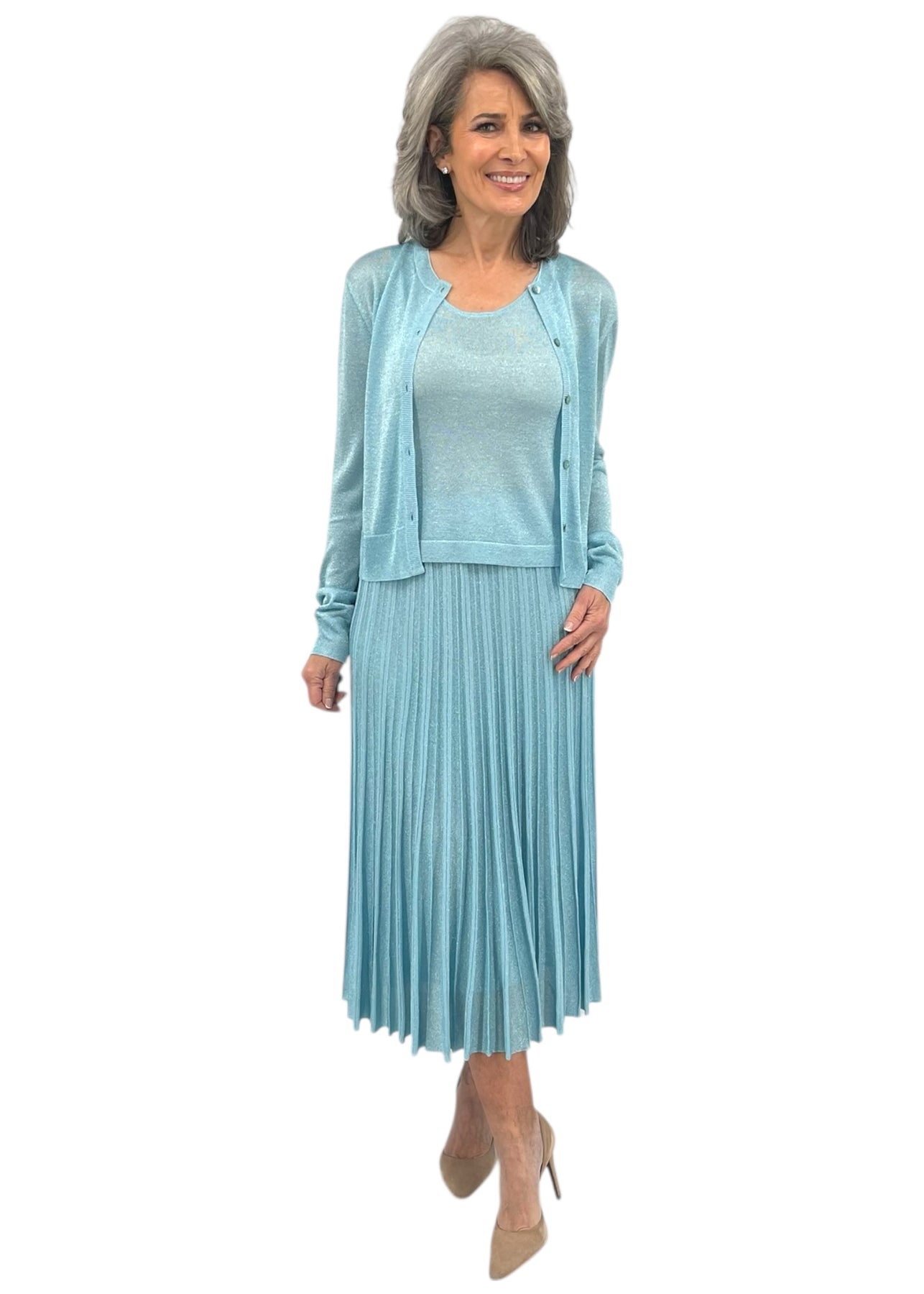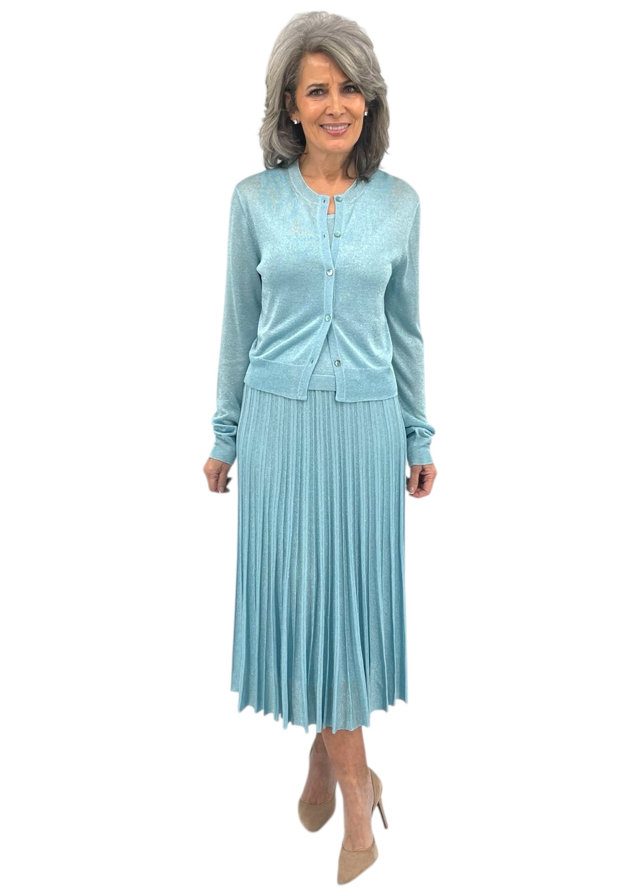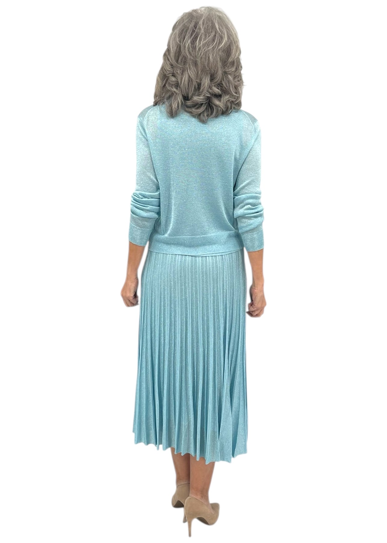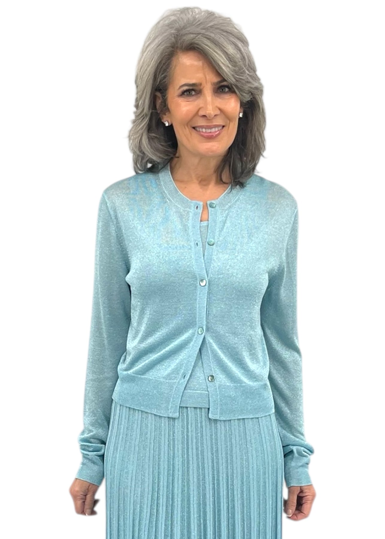 Elevate your look with this shimmering Gala Cardigan in Aqua. Crafted with luxurious lurex threading, it catches the light beautifully for an effortlessly chic aesthetic. The sleek cardigan silhouette pairs perfectly with tailored trousers or a flowing skirt, making it ideal for cocktail events, dinner dates, or upscale casual occasions. The soft, breathable fabric ensures comfort while you shine.