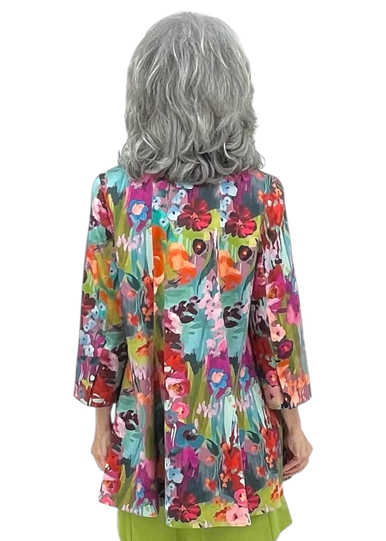 Elevate your wardrobe with this timeless swing coat, where classic tailoring meets delicate floral elegance. The relaxed, flowing silhouette flatters every figure while the refined botanical print adds a touch of understated charm. Perfect for layering over dresses or casual pieces, this versatile coat transitions seamlessly from season to season. A sophisticated staple that brings effortless polish to any ensemble. Pair with the matching floral pants, or any of the various like-colored solids.
