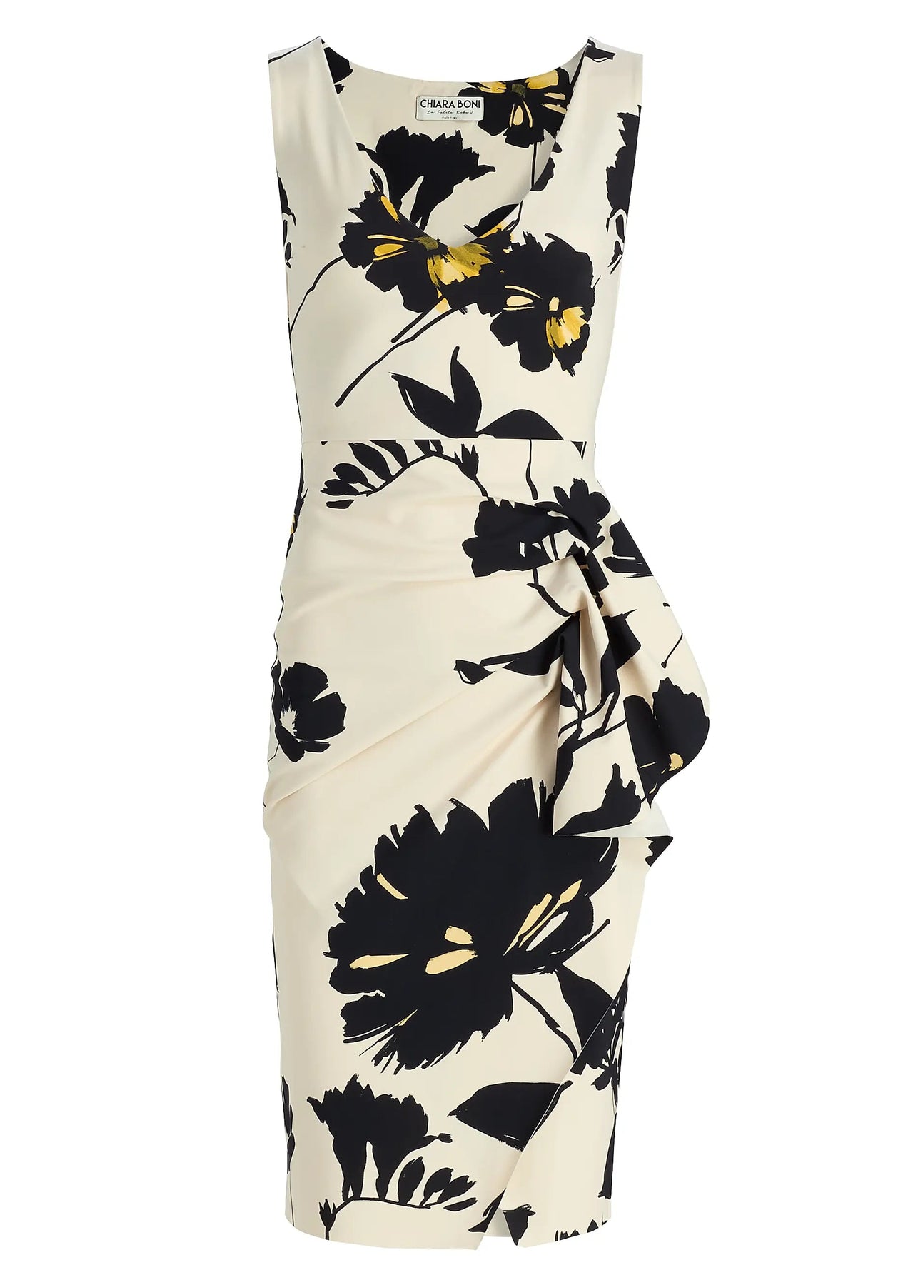 Ayang Print SJE Dress in AvaChiara Boni La Petite Robe's Ayang cocktail dress masterfully combines structured elegance with effortless comfort, crafted of the brand's signature stretch-jersey. The three-quarter sleeves and V-neckline lead into a body-con silhouette, uniquely accented by a cascading ruffle skirt and a raw-edge hem for seamless touch.