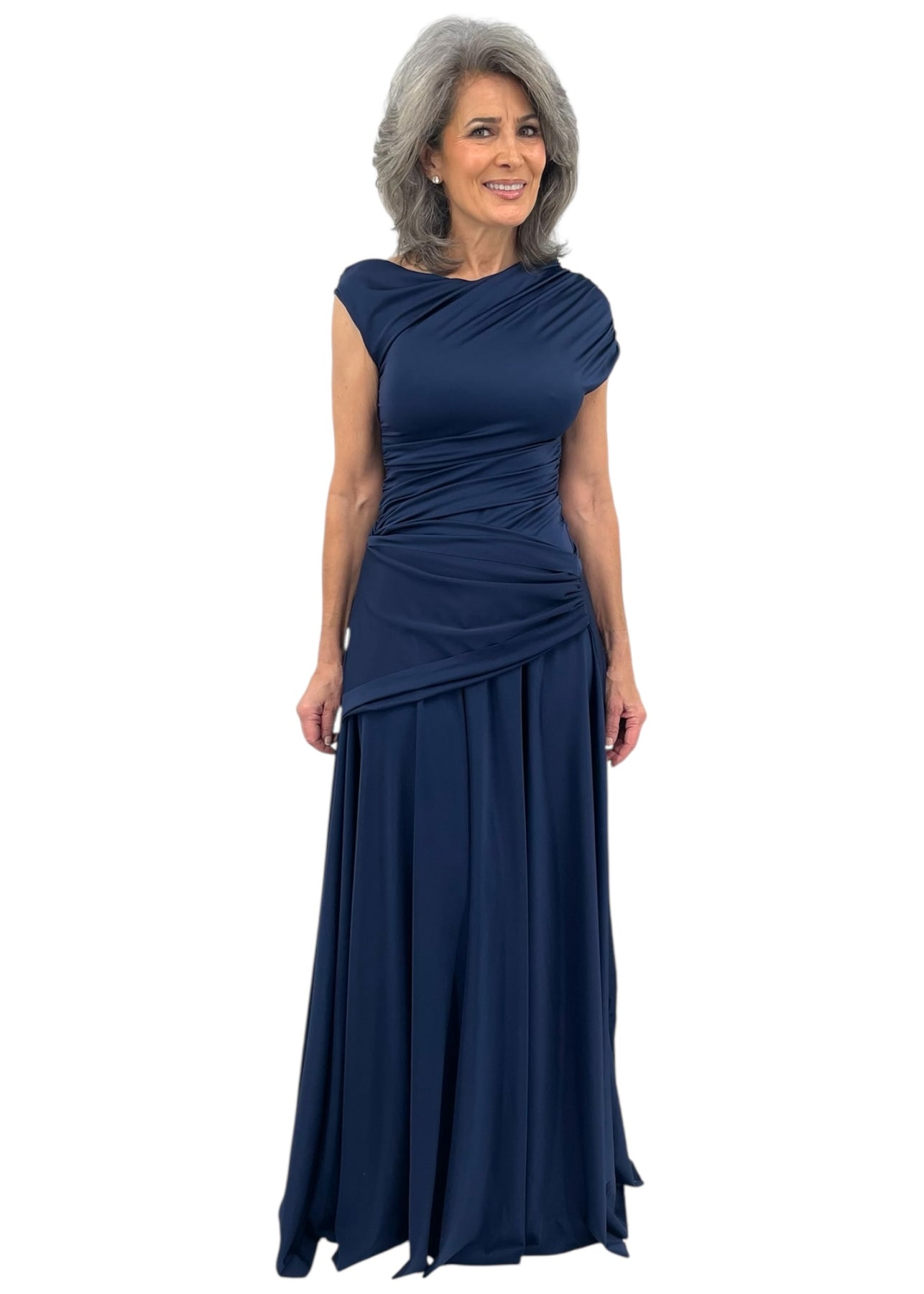 The Becia JJ Long Gown in Midnight features a draped fabric waist that enhances silhouette appeal, making it an ideal choice for mothers of the bride or groom. Its elegant design provides both comfort and sophistication, ensuring a refined appearance for formal occasions.