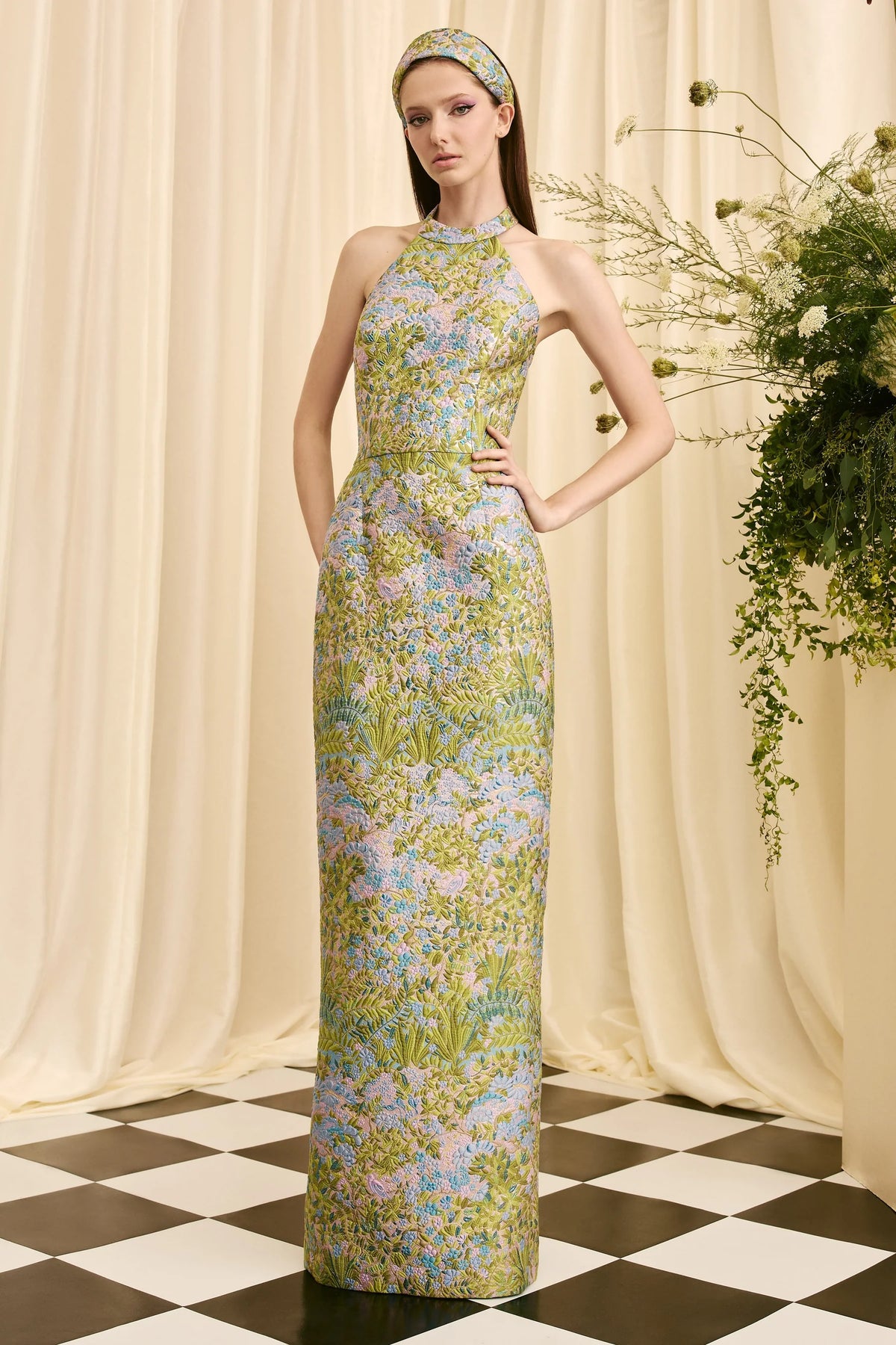 This couture creation features a refined halter neckline that gracefully highlights the shoulders, while the sleeveless design allows for ultimate freedom of movement. The enchanting mermaid silhouette hugs the body, flowing into a floor-length finish that exudes sophistication. Adorned with exquisite embroidery and shimmering beading, this gown is perfect for the modern mother of the bride or any formal occasion.