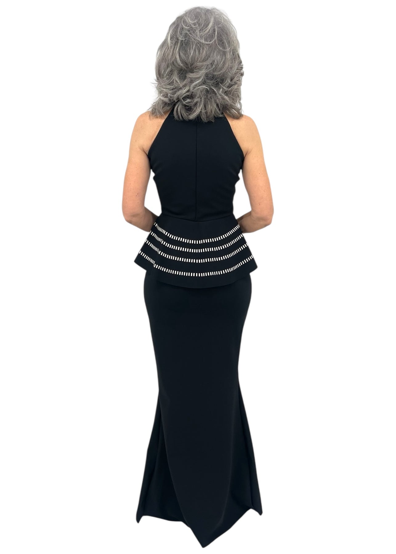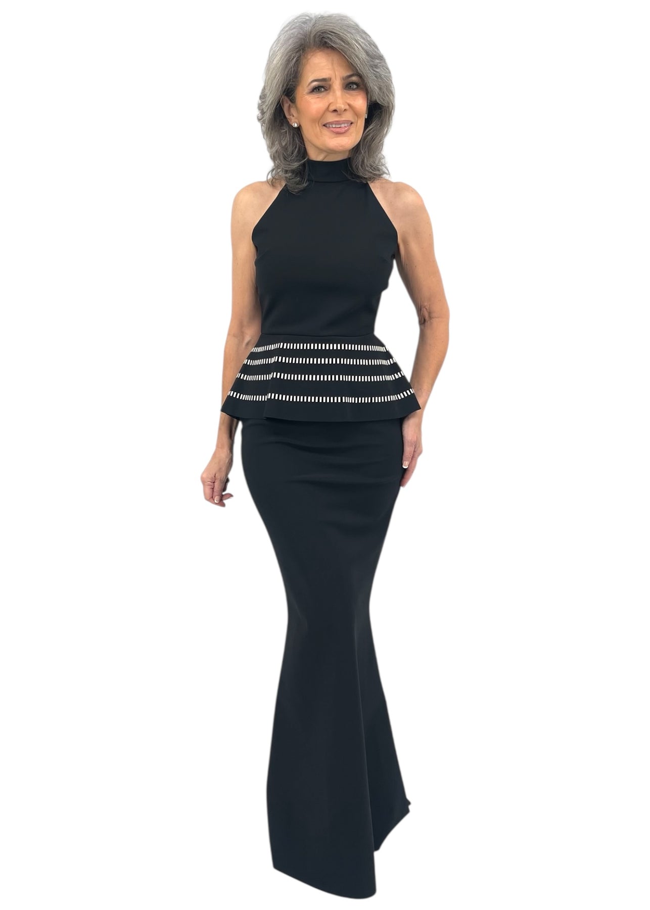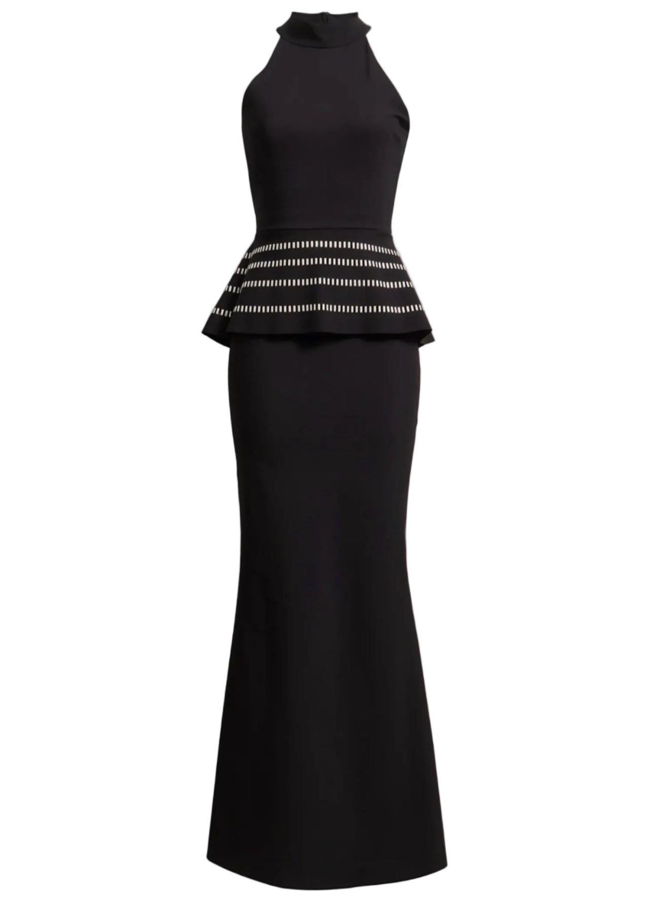 A fluttery peplum and a flared mermaid hem gives shape to this stretchy high-neck gown. Perfect for destination events, this formal dress is finished with a fray-resistant raw hem for easy tailoring.