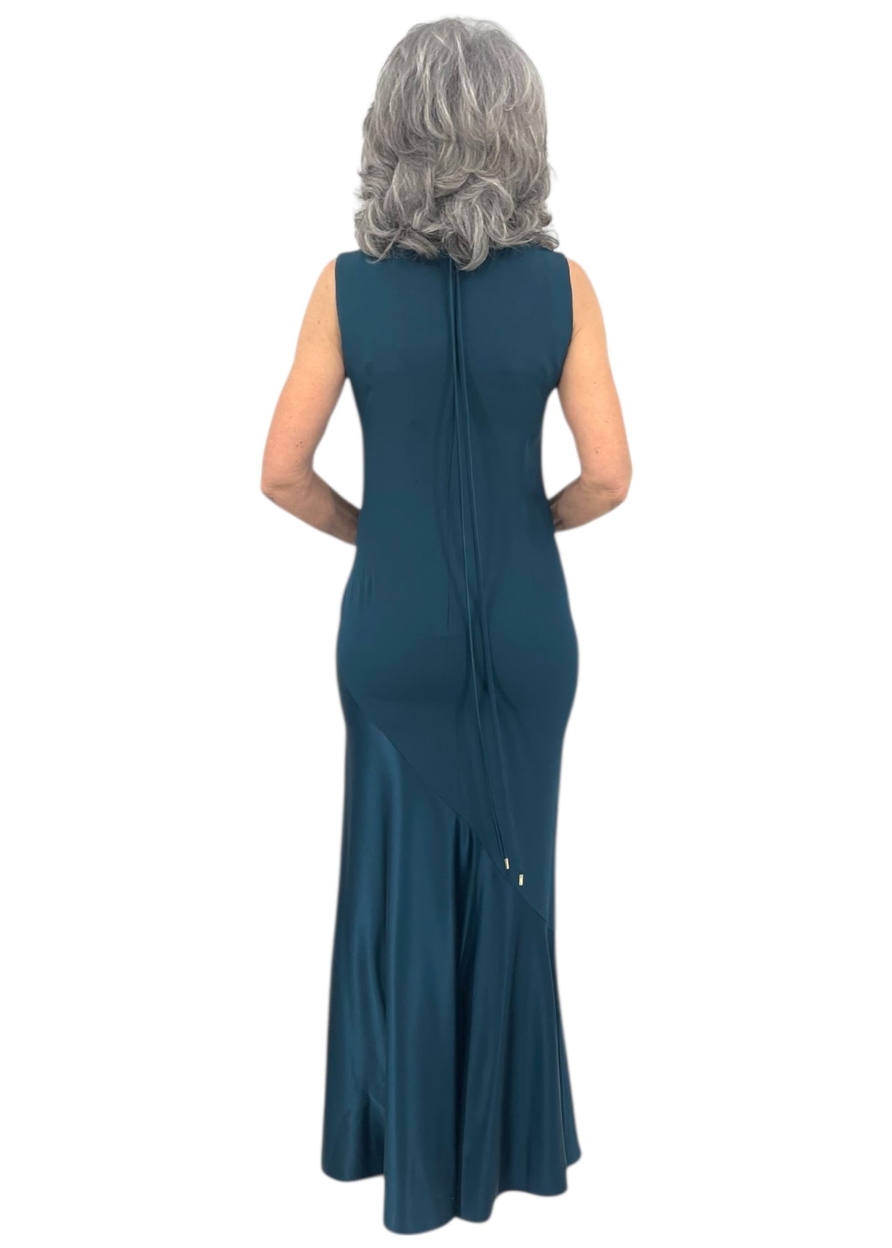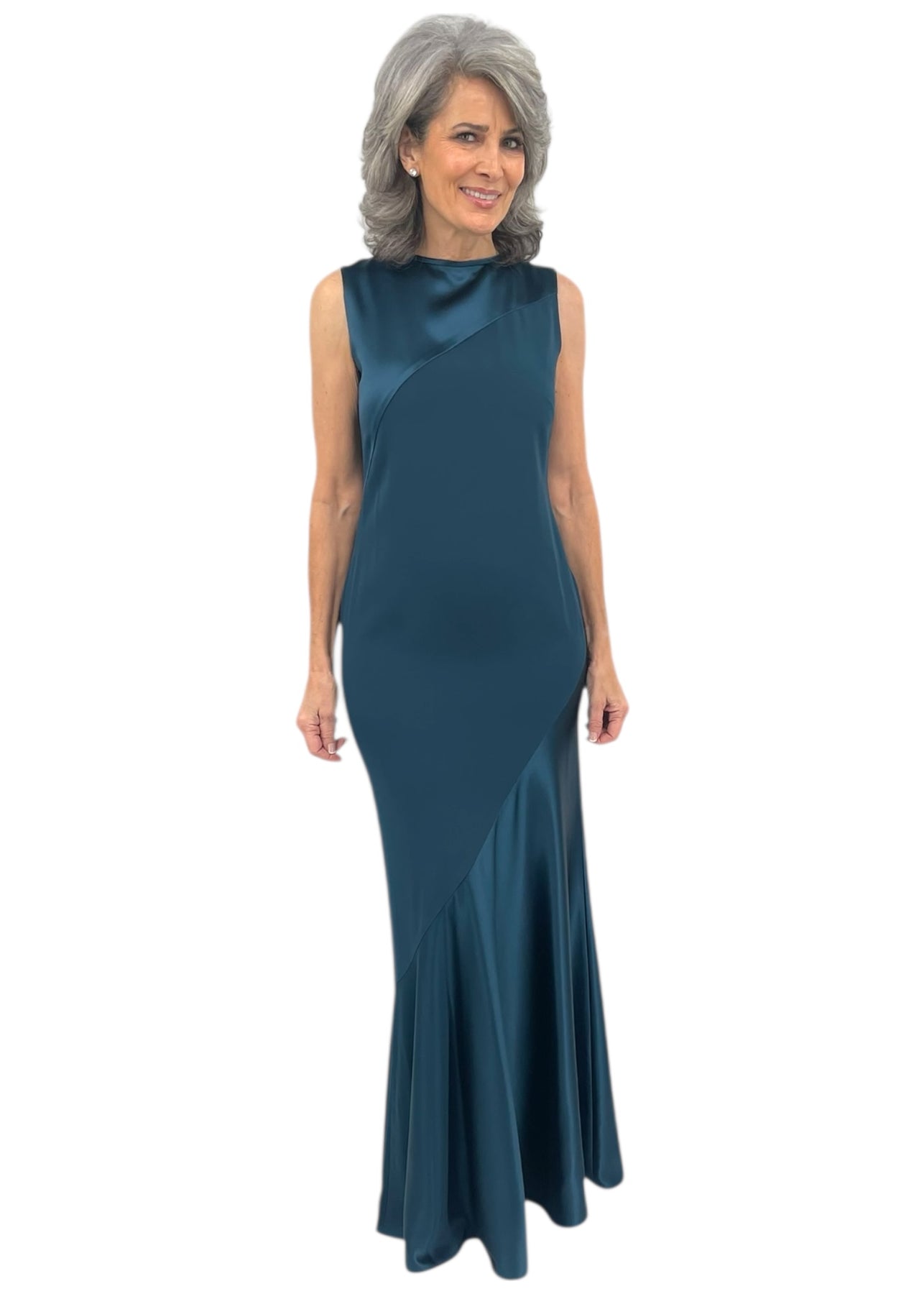 Satin Sleeveless Gown w/ Bias Flared Skirt in Deep Sea