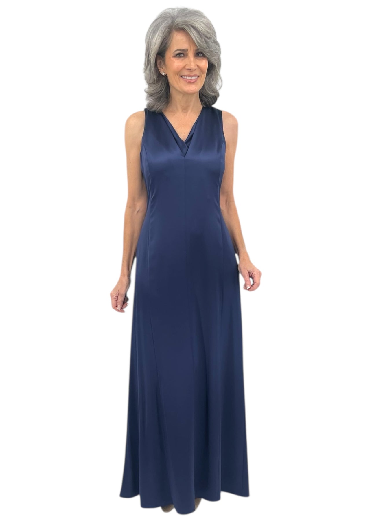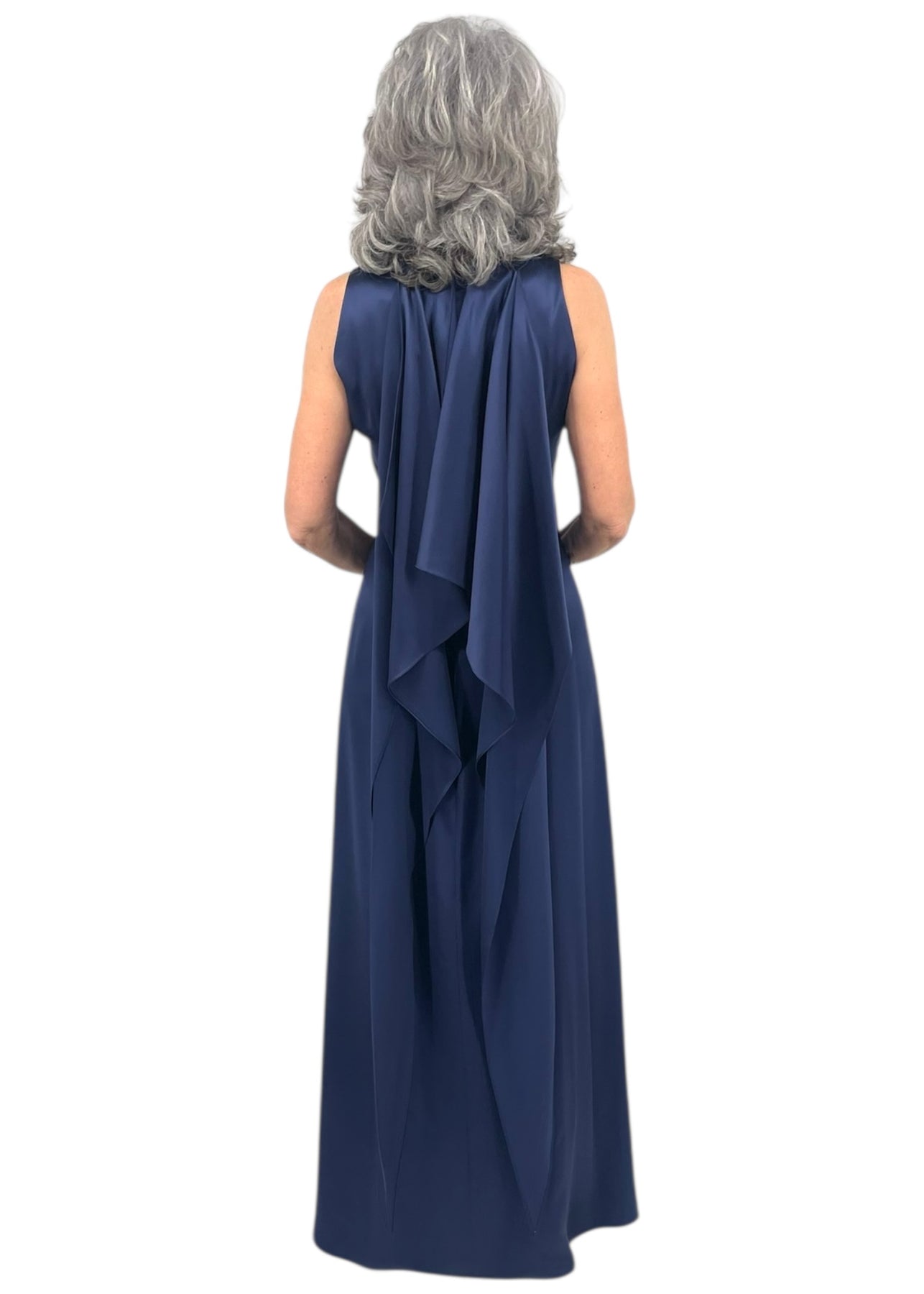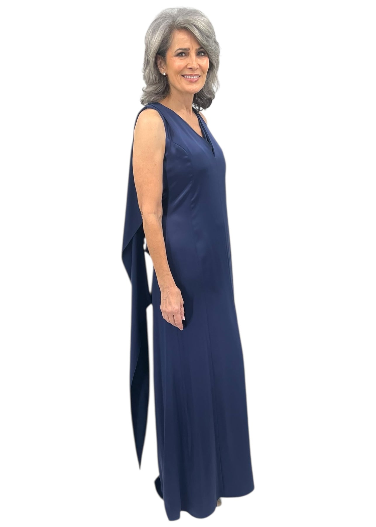 A beautifully shaped satin gown with a soft A-line skirt. The V neck has an elegantly pleated inset in matching satin and the back of the dress has two long cascading panels that can be worn down or wrapped as a shawl for arm and shoulder coverage. This gown is fully lined and zips at the center back.