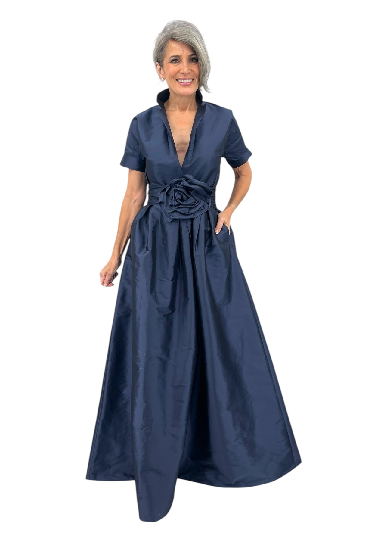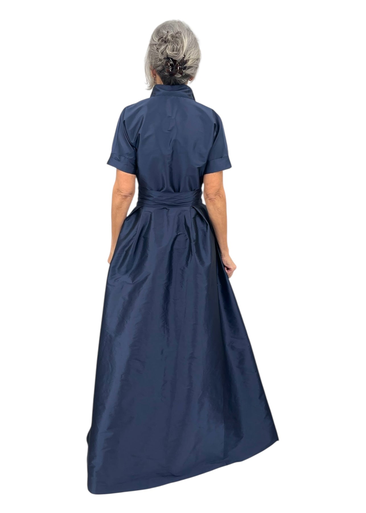 Stoya Taffeta Gown in Midnight An elegant floor-length gown crafted from luxurious taffeta in a rich midnight hue. The understated silhouette emphasizes refined tailoring and timeless sophistication, making it an ideal choice for formal occasions where quiet luxury speaks louder than embellishment. The structured fabric drapes beautifully, creating movement without drama. Perfect for evening galas, black-tie events, or any occasion calling for polished, editorial elegance.