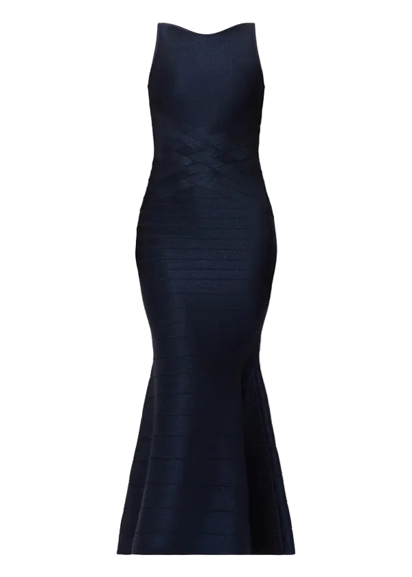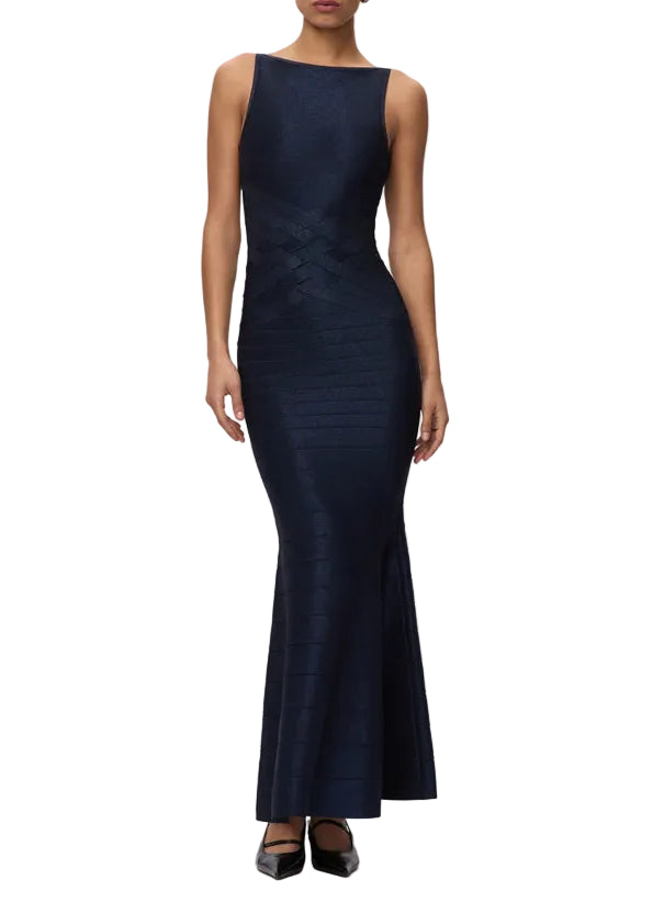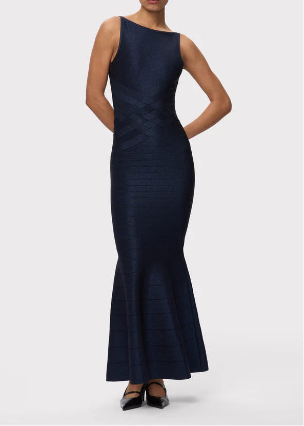 The Lurex Dion Gown, new for Spring '26, is a floor-length silhouette featuring a boat neckline with a low back and mermaid hem. Cut from bandage with a metallic denim effect, it has true bandage weave detailing to define the waist. The gown is finished with a center-back zip.