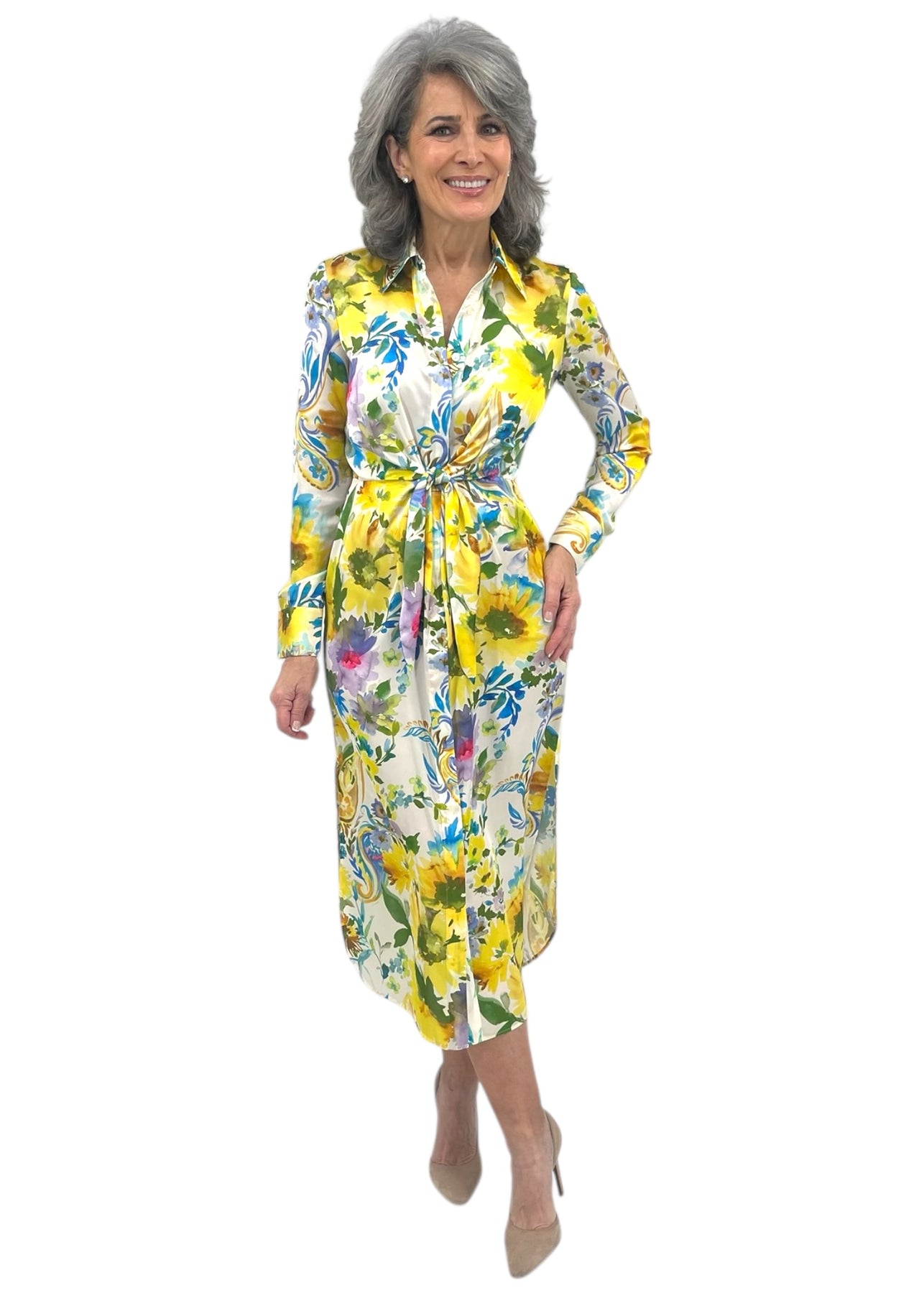 Elevate your everyday style with this eye-catching shirtdress featuring a playful water color splatter design. The tie-front detail adds a chic, adjustable fit that flatters every silhouette, while the classic button-down construction keeps things polished and versatile. Perfect for casual outings or dressed up for brunch, this piece effortlessly transitions from day to night. The vibrant watercolor print brings artistic flair to your wardrobe, making it a fun statement piece that pairs beautifully with sneakers, sandals, or heels.