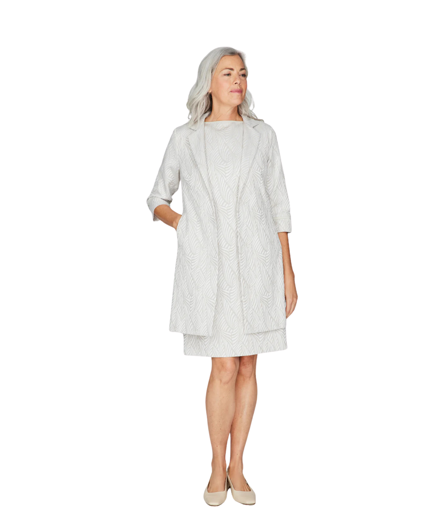 Elevate your wardrobe with this sophisticated long blazer, crafted from tonal botanic stretch jacquard in a versatile stone hue. The refined bias trim detailing adds a polished finish, making it the perfect layering piece for any occasion. Wear it as a guest of honor at special events or pair it with a matching dress for a coordinated, chic ensemble. The stretch fabric ensures comfort and movement throughout your day, while the tailored silhouette flatters every frame.