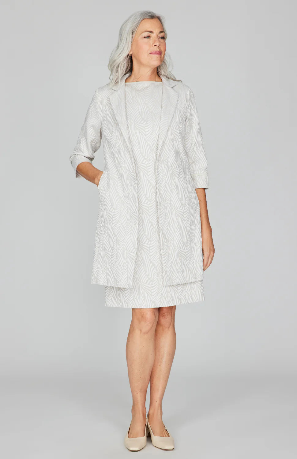 Elevate your wardrobe with this sophisticated sleeveless sheath dress, crafted from luxurious stretch jacquard in a refined stone palette. The tonal botanical design creates an understated elegance, while the bias-cut detail adds subtle movement and dimension. Perfect for guest-of occasions, this chic piece transitions seamlessly from daytime events to evening affairs. The stretch fabric ensures a comfortable, flattering fit that moves with you throughout the day.