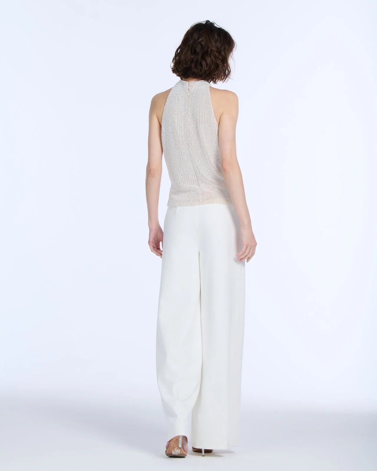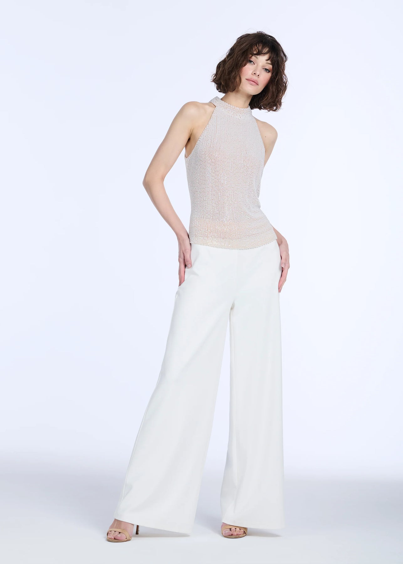 Dramatic mock neck halter tank fully encrusted, top to bottom in tiny pearls. Our number one special event top is truly elegant. Wear with our taffeta or stretch satin skirts, our fabulous stretch crepe pant or your favorite jeans.