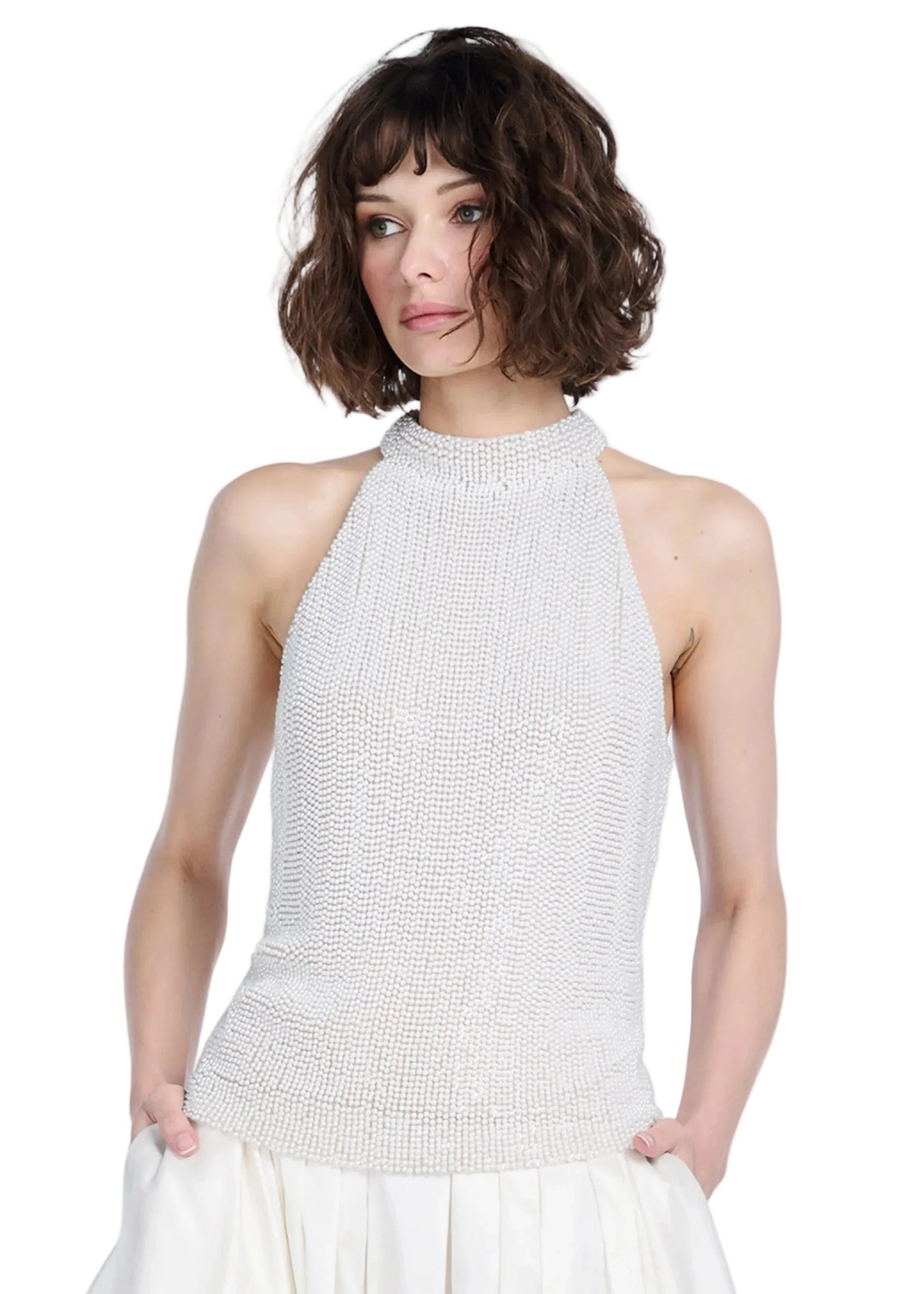 Pearl Encrusted Sleeveless Mock Neck in Ivory Pearl
