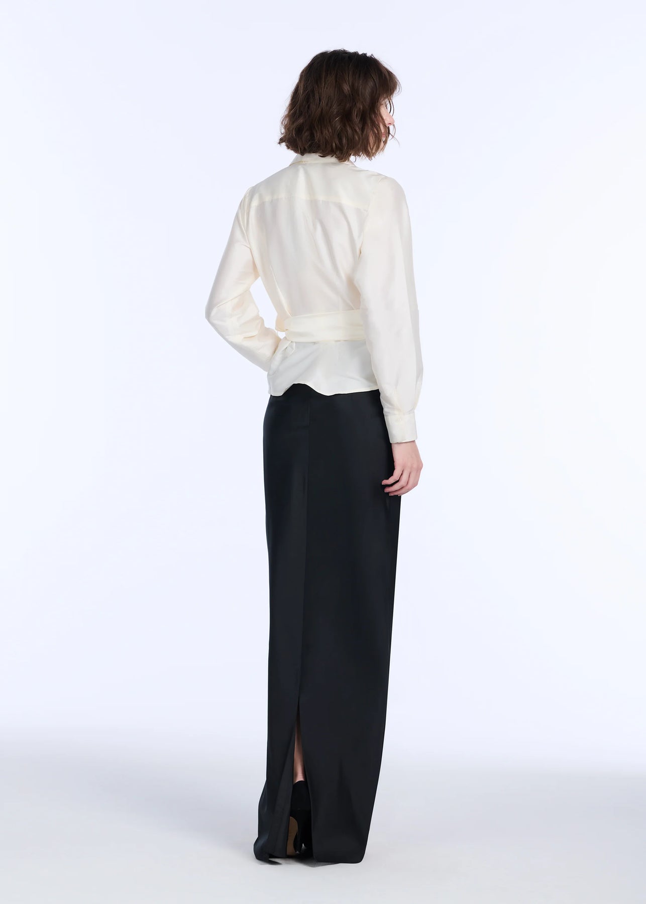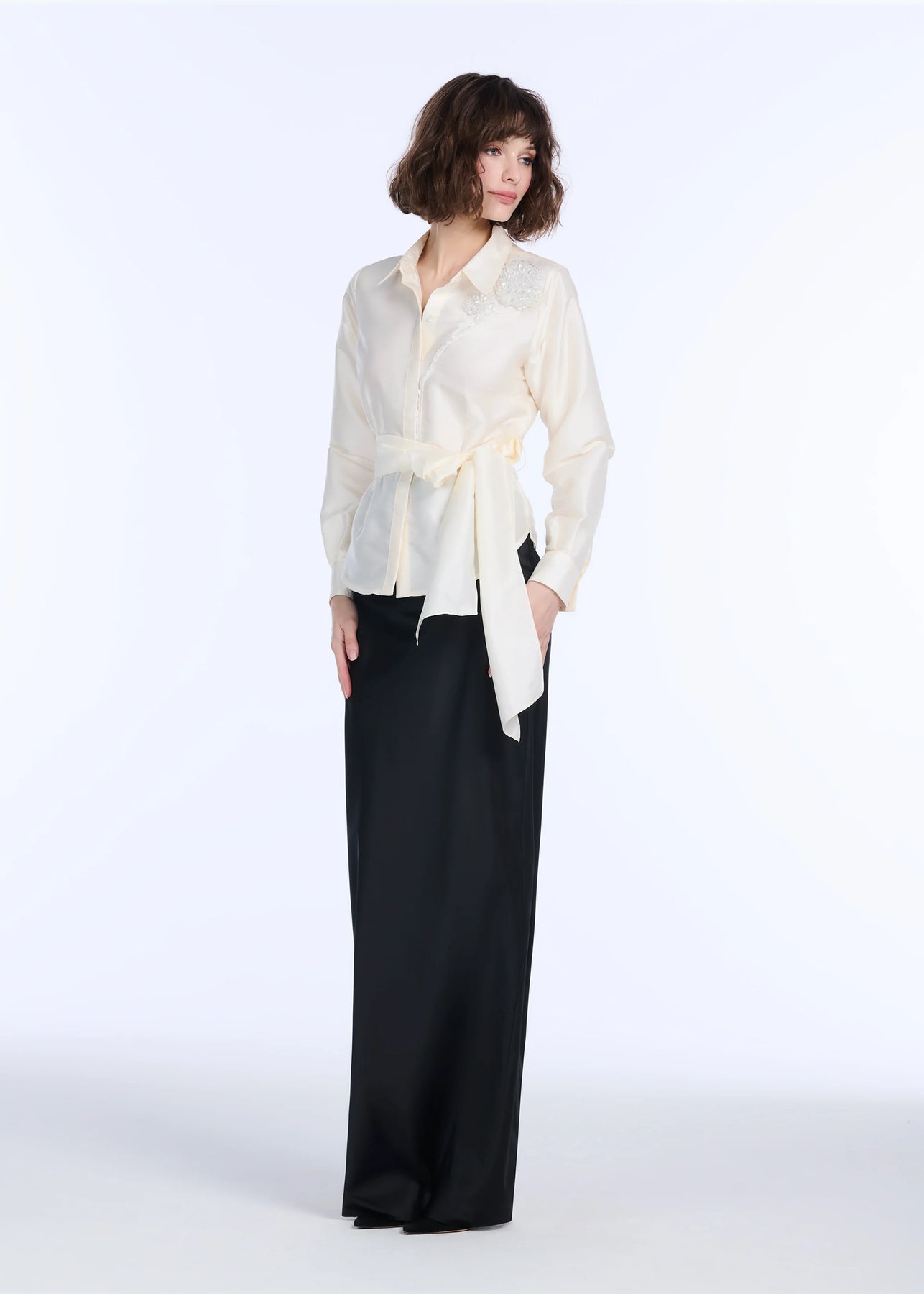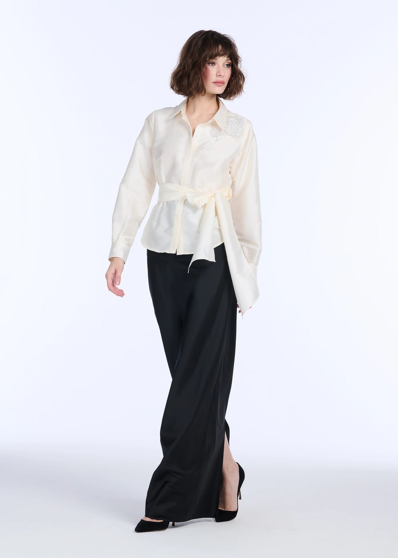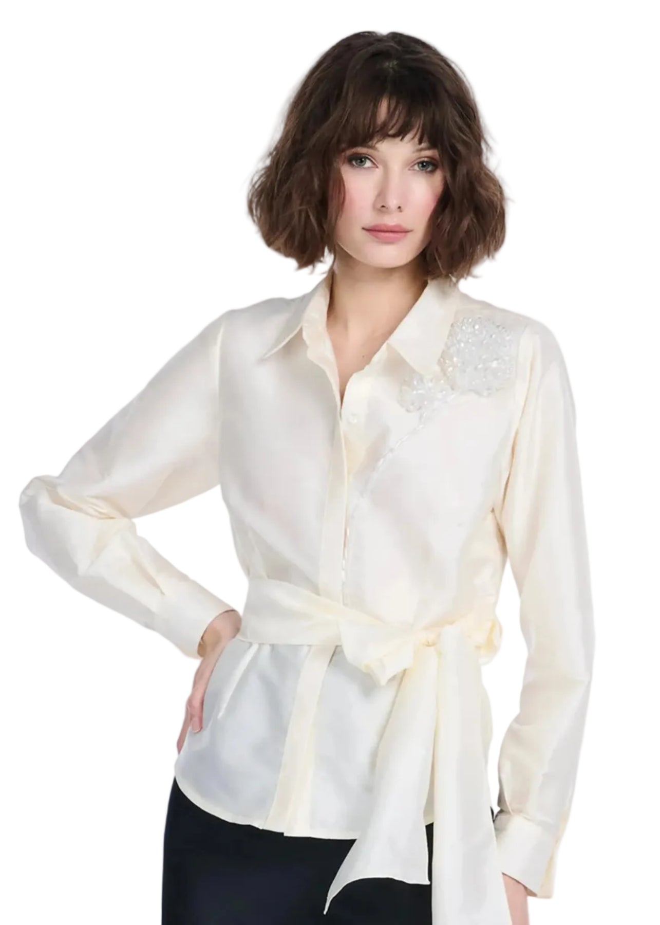 Luminescent chandelier crystals create this outstanding feminine blouse. Crystal, hand beaded peony lilts over the shoulder. Sash gathers the waist. Wear with our taffeta or stretch satin skirts, our fabulous stretch crepe pant or your favorite jeans.