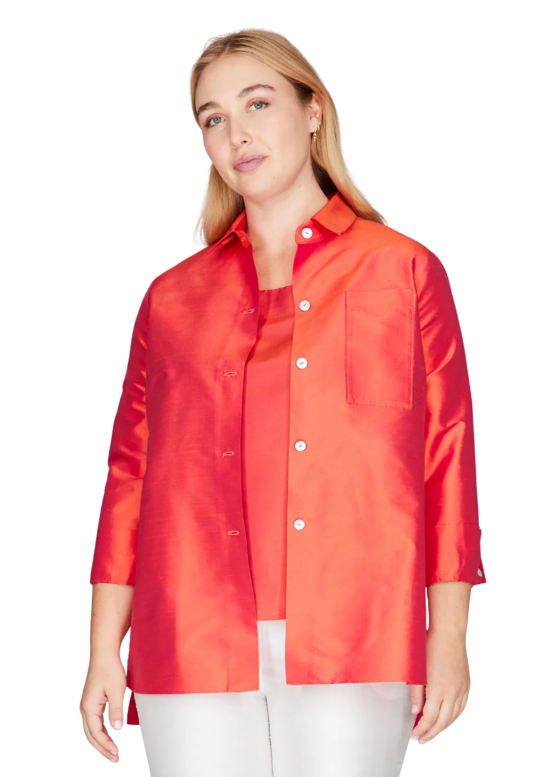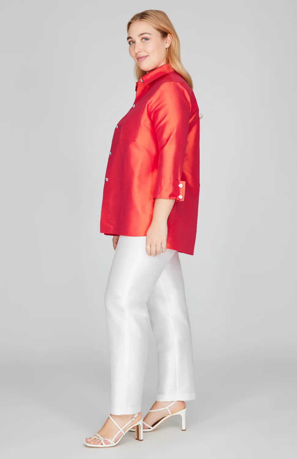 Elevate your wardrobe with this sophisticated silk shantung button-down, featuring a refined collared neckline and functional side tabs for a tailored silhouette. The luxurious fabric drapes beautifully while maintaining its structure, perfect for creating polished, versatile looks. The vibrant hue adds a contemporary edge to classic styling. Ideal for both professional settings and elevated casual occasions, this piece transitions seamlessly from day to evening wear.