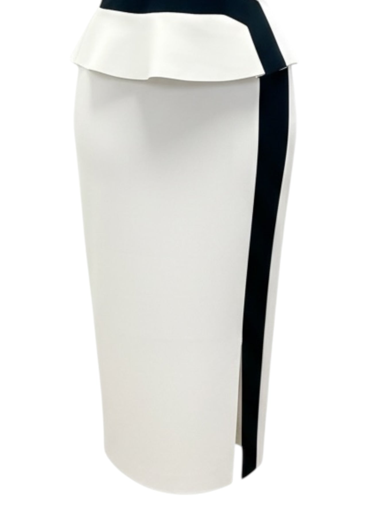 Elevate your wardrobe with the Georgy Bodycon Skirt in White/Black. Designed for the derby, this skirt is both stylish and versatile. Its form-fitting silhouette exudes sophistication and elegance, making you stand out from the crowd. Don't just dress for the occasion, embody it with the Georgy Bodycon Skirt.