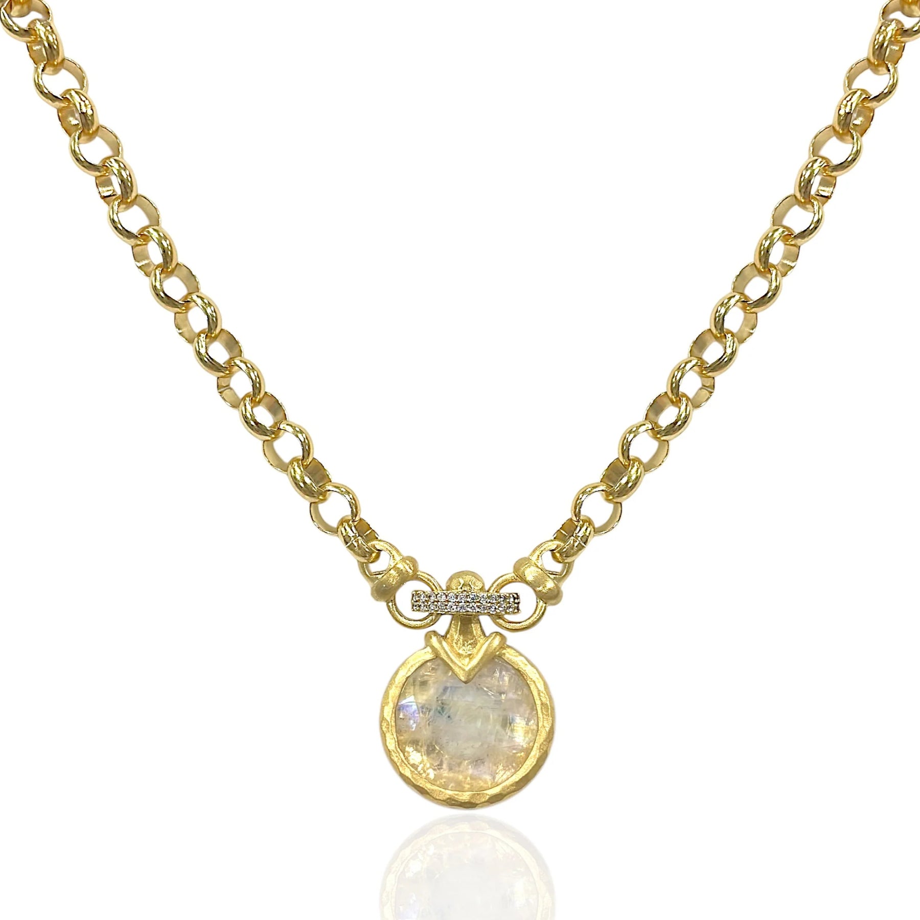 The luminous moonstone captures light beautifully, offering a subtle rainbow sheen that adds a unique elegance to any outfit. Crafted in warm gold tones, this necklace seamlessly blends classic sophistication with a modern edge, making it perfect for both everyday wear and special occasions. Embrace a piece that not only enhances your look but becomes an enduring symbol of grace and allure.