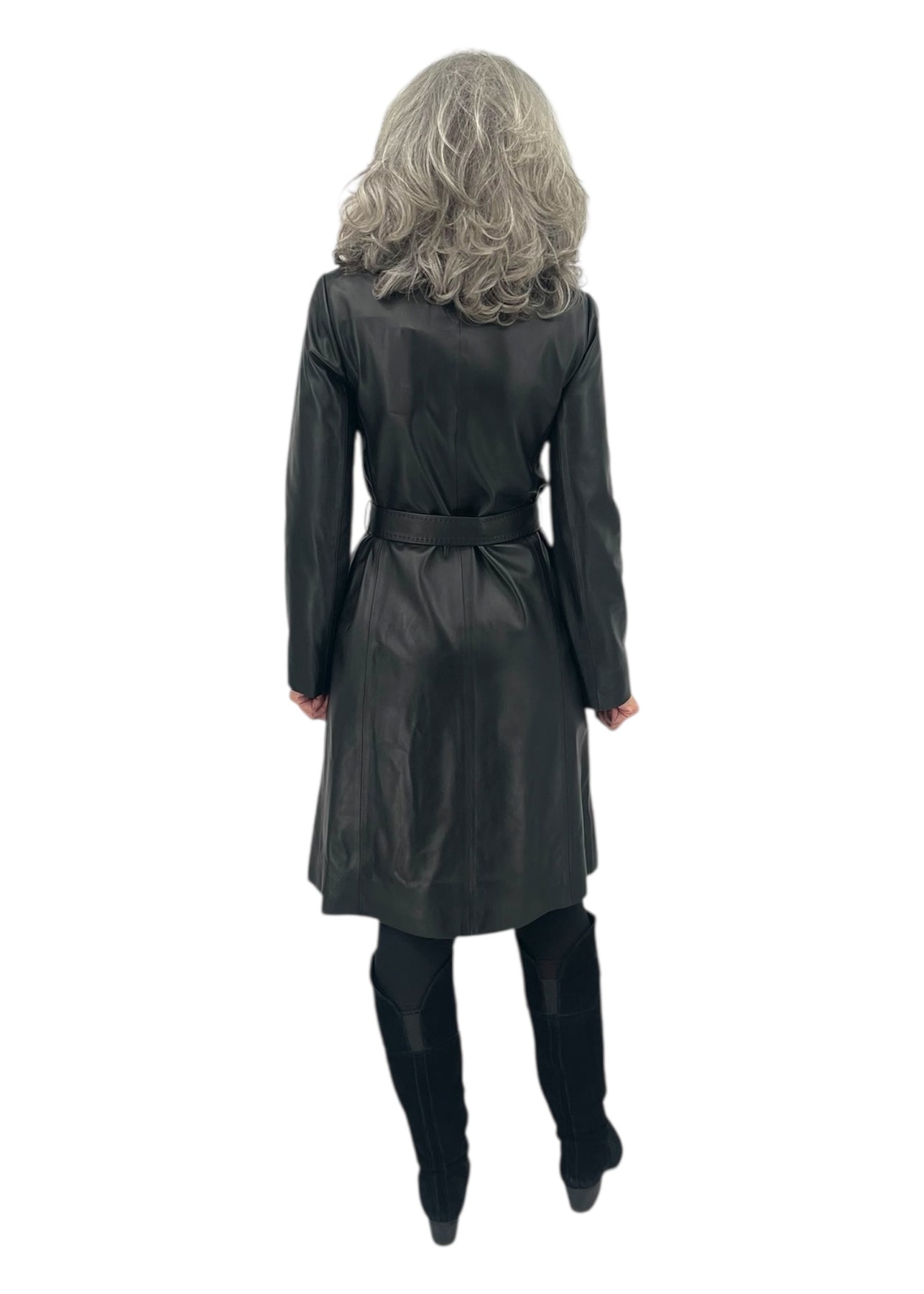 Elevate your outerwear with the Evelyn Leather Collarless Coat in Black. Featuring a sleek collarless design and refined pick-stitch detailing, this coat exudes modern sophistication. The snap-front closure ensures effortless wear, while the tie belt cinches the waist for a flattering silhouette. Crafted to combine style and function, it’s the perfect statement piece for versatile, timeless looks.