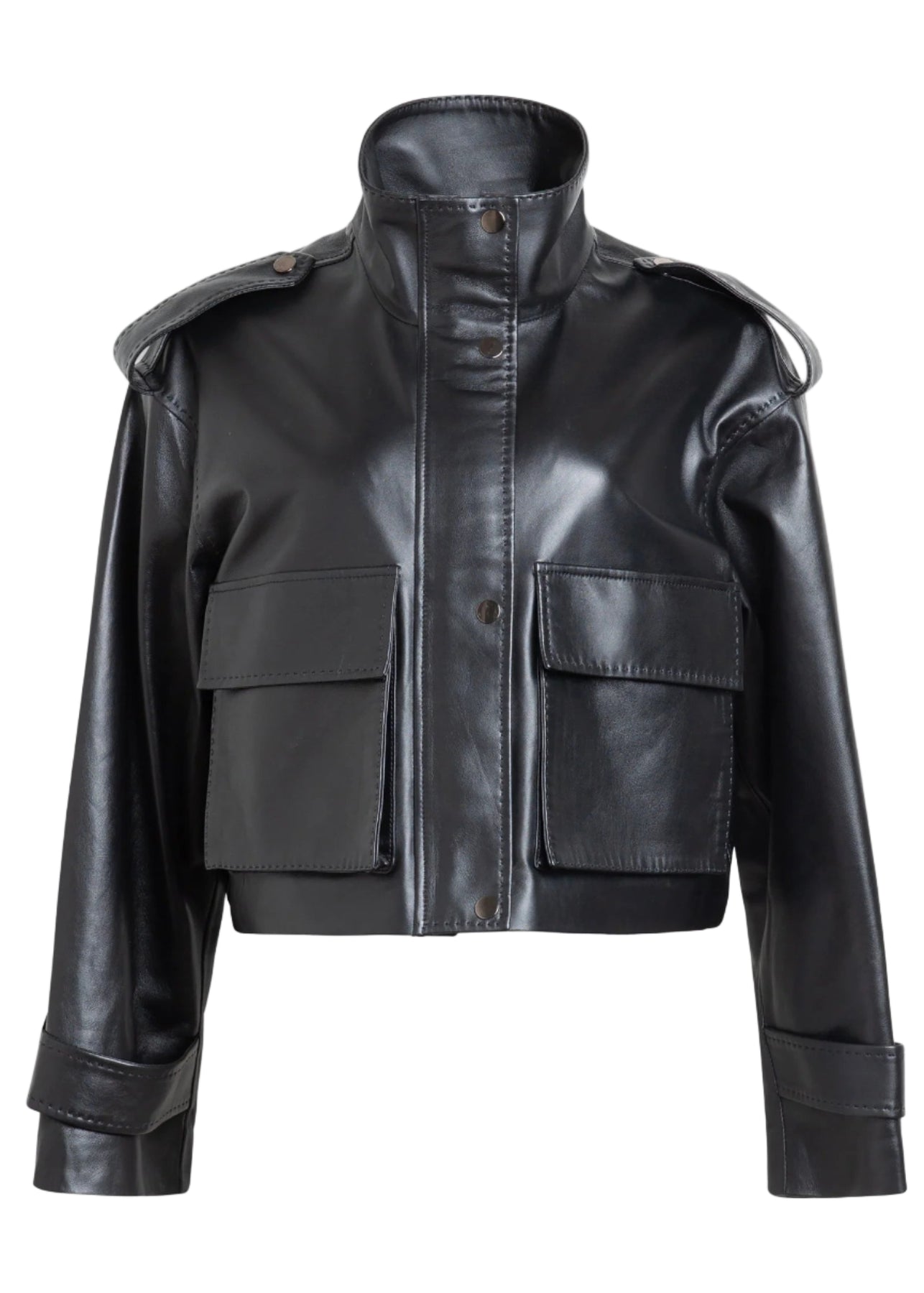 The Lena Leather Zip Jacket in Black offers a modern cropped length and a trendy boxy fit that effortlessly complements any outfit. Featuring a secure zipper closure enhanced with stylish snap details, this jacket combines edgy design with practical wearability. Perfect for adding a bold, contemporary edge to your wardrobe while ensuring comfort and ease of movement.