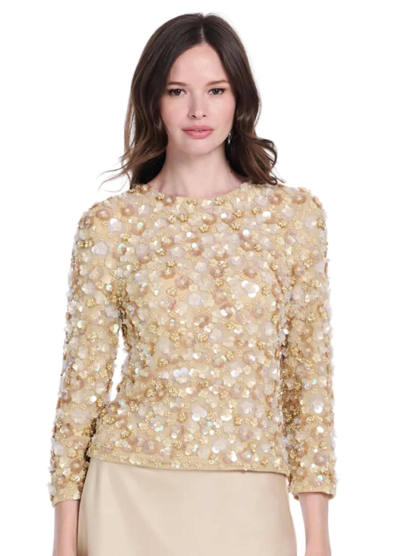 This striking beaded top in champagne brings glamour to any occasion. The intricate beadwork shimmers with every movement. Perfect on its own or paired with the matching skirt for a coordinated, head-turning ensemble.