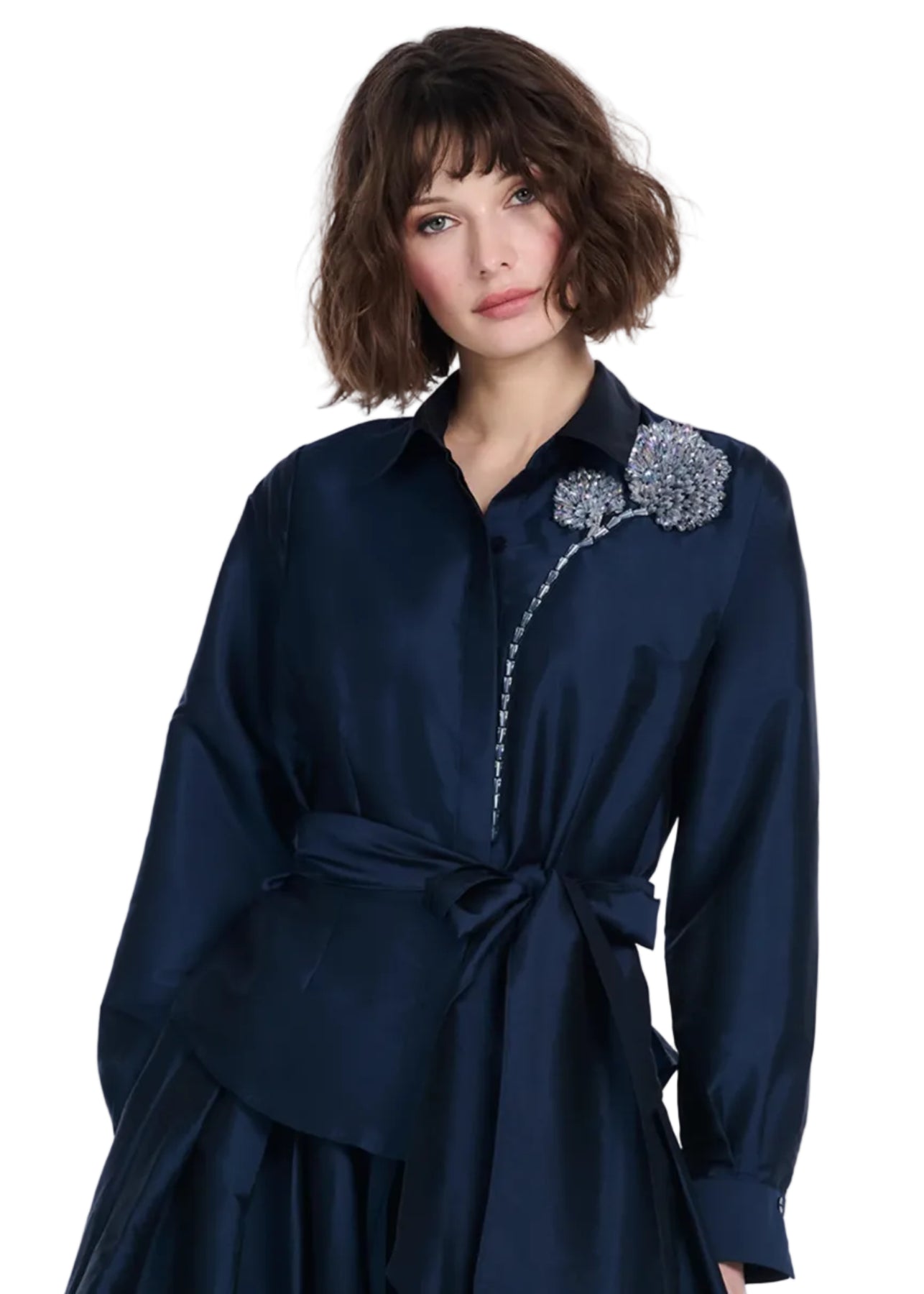 Luminescent chandelier crystals create this outstanding feminine blouse. Crystal, hand beaded peony lilts over the shoulder. Sash gathers the waist.
