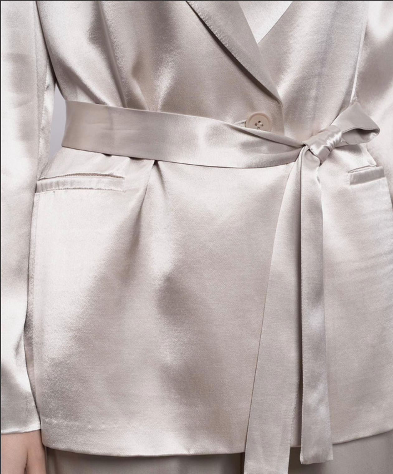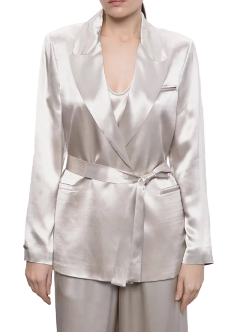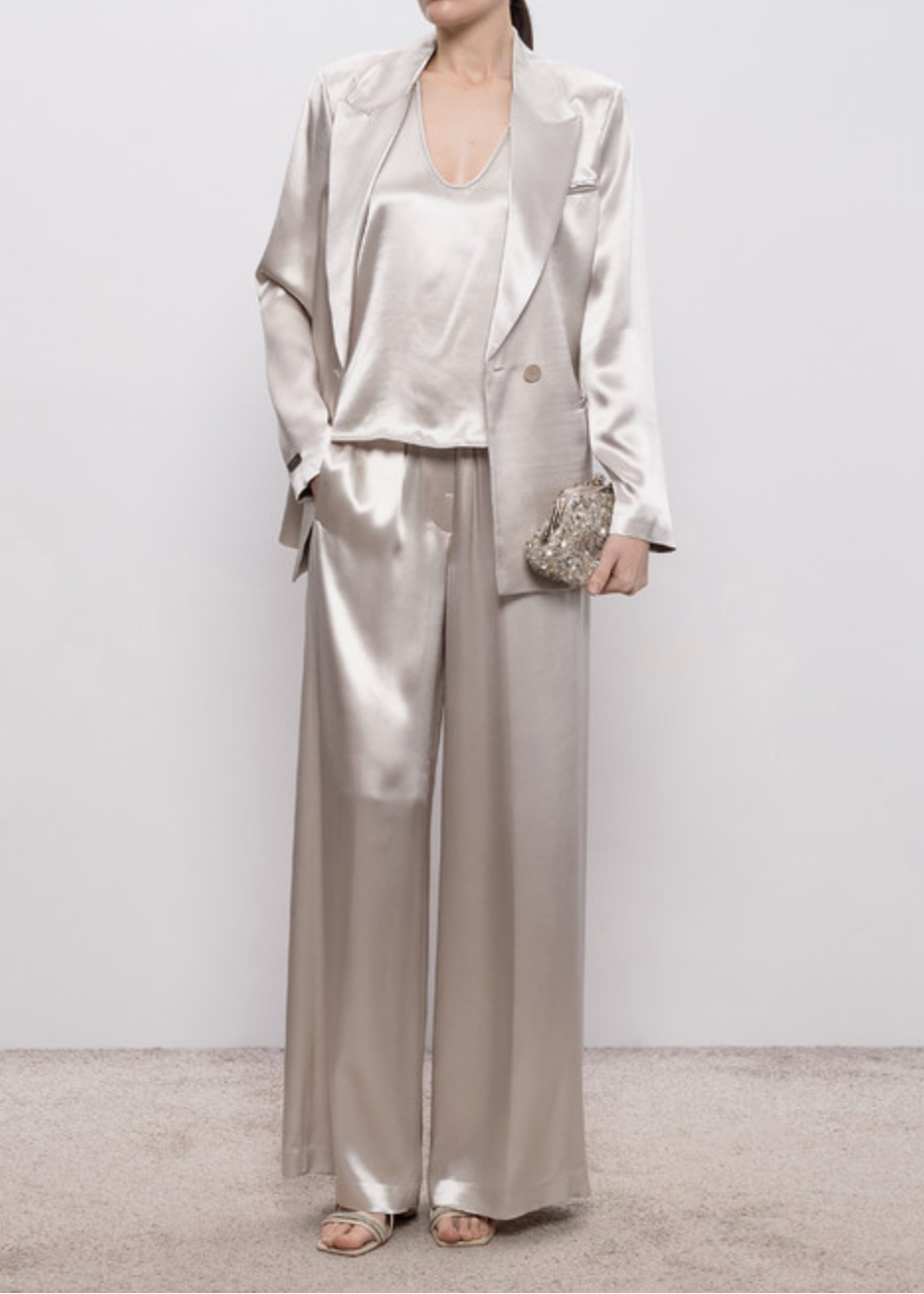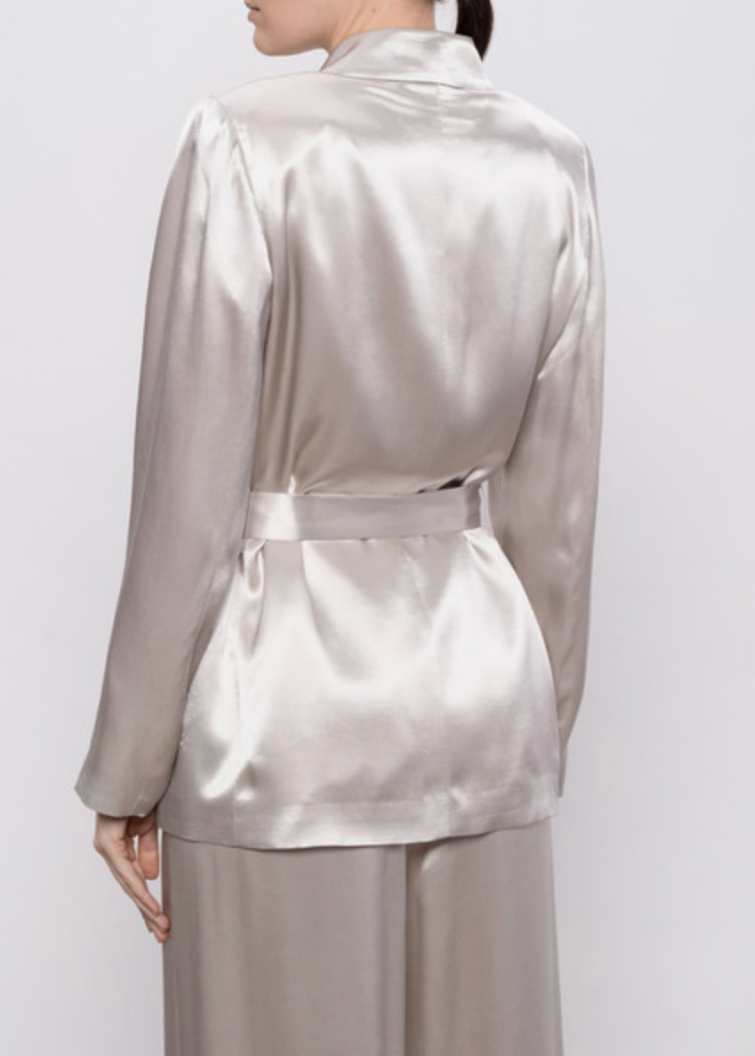 An interplay of light and movement characterizes this jacket in fluid viscose satin, a material that envelopes the figure with lightness and naturalness. The fabric gently captures reflections with every movement.