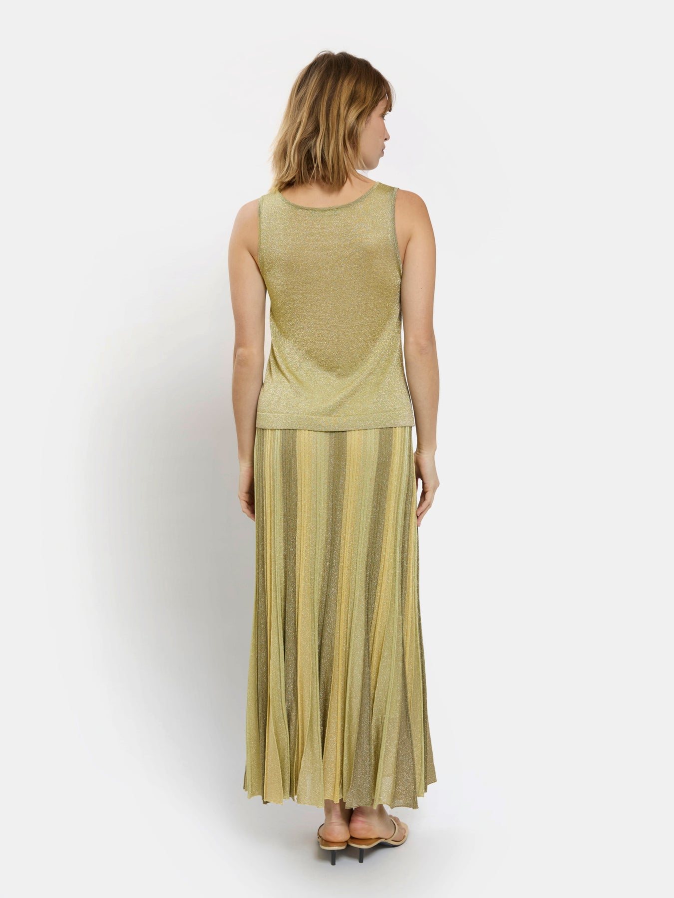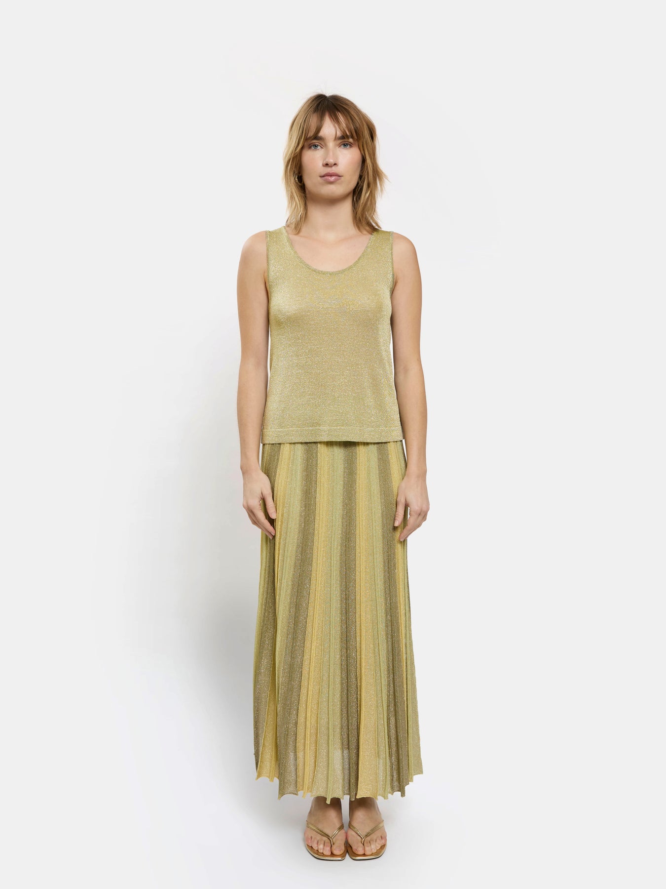 Elevate your evening look with this shimmering Gala Tank Top in Lime. Crafted with luxurious lurex threading, it catches the light beautifully for an effortlessly chic aesthetic. The sleek tank silhouette pairs perfectly with tailored trousers or a flowing skirt, making it ideal for cocktail events, dinner dates, or upscale casual occasions. The soft, breathable fabric ensures comfort while you shine.