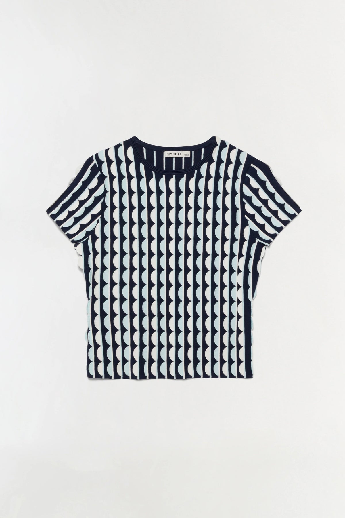 Crafted in a compact knit, this short-sleeve top features a sculpted fit and a rhythmic scallop pattern throughout. The streamlined profile offers structure while maintaining ease. A polished essential with a refined graphic edge.