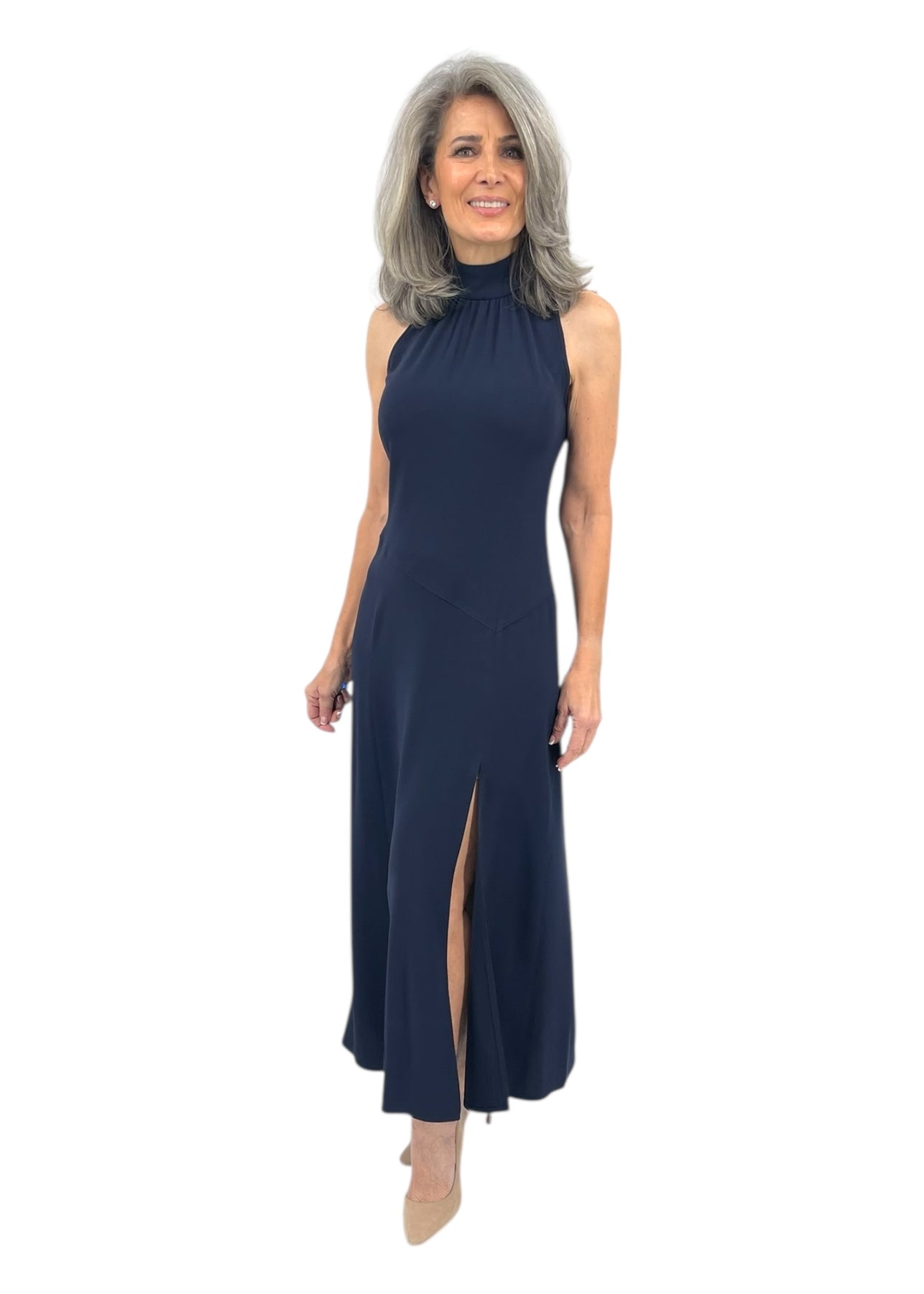 Indulge in timeless elegance with our Matte Crepe Maxi Halter Dress in Navy. The chic halter neckline highlights your shoulders while the matte crepe fabric drapes effortlessly for a sophisticated silhouette. Perfect for any occasion, this dress is a must-have in your wardrobe.