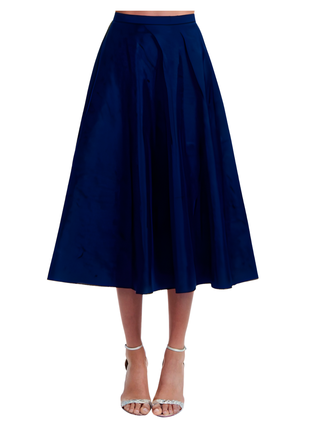 This navy taffeta A-line midi skirt exudes effortless chic. Its luxurious fabric and classic silhouette create a timeless piece that will elevate any look. The perfect addition to your wardrobe, this piece will make you feel elegant and exclusive with every wear.