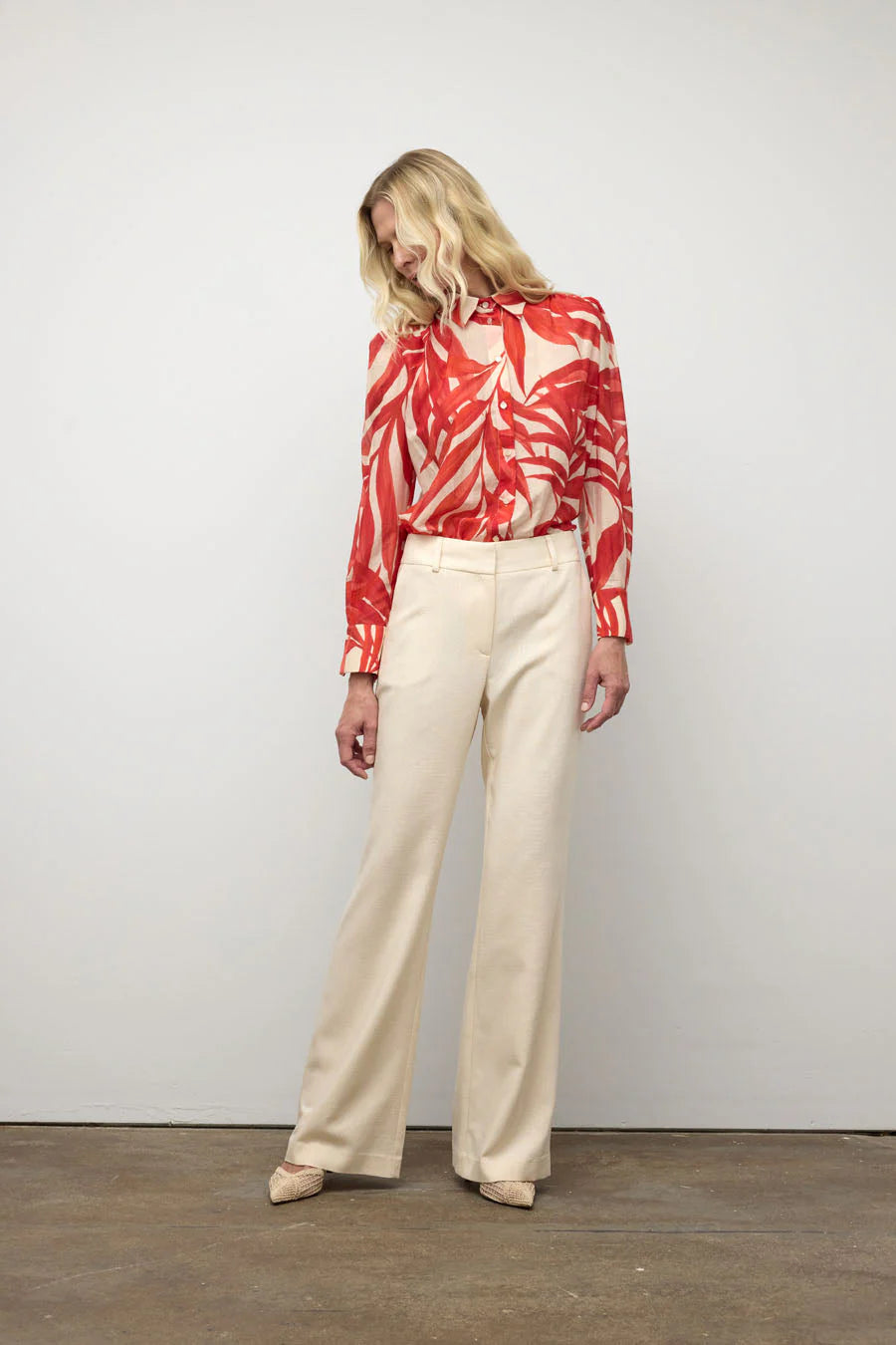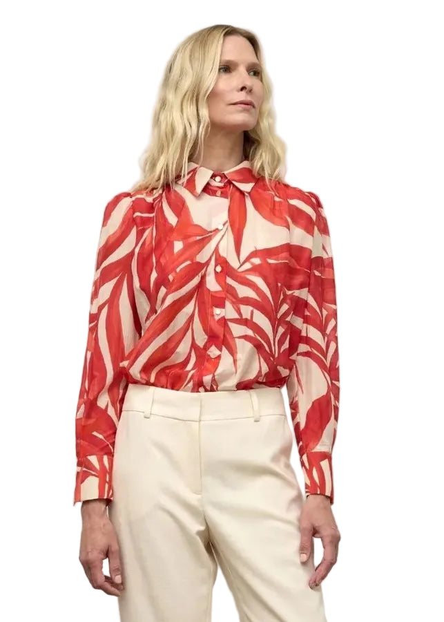 Elevate your wardrobe with this sophisticated floral print puff sleeve blouse in rich red. The romantic puff sleeves add dimension and elegance, while the delicate floral pattern brings visual interest to any ensemble. Pair effortlessly with our taupe pants in wide leg or slim silhouettes for a polished, coordinated look that transitions seamlessly from office to evening occasions.