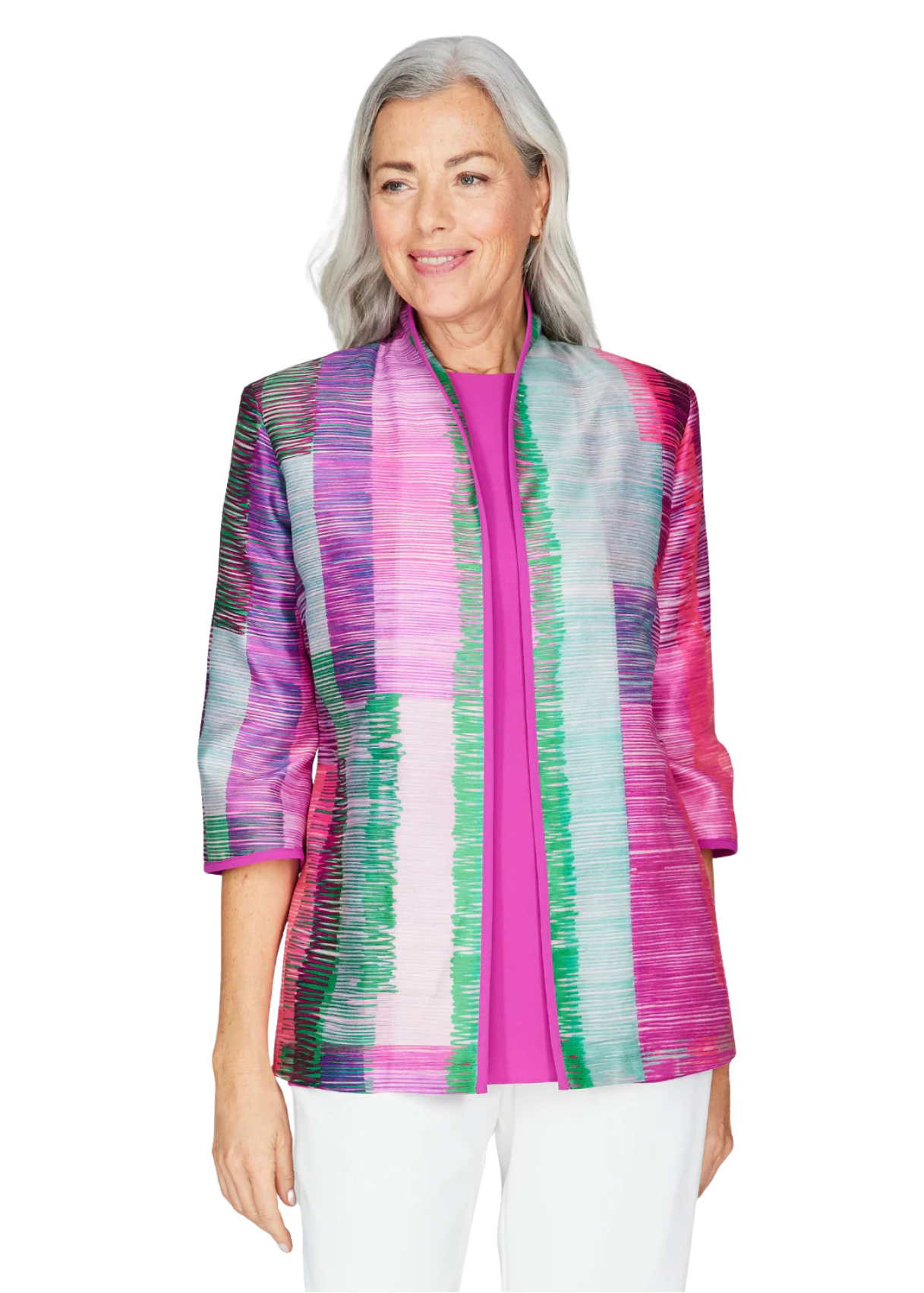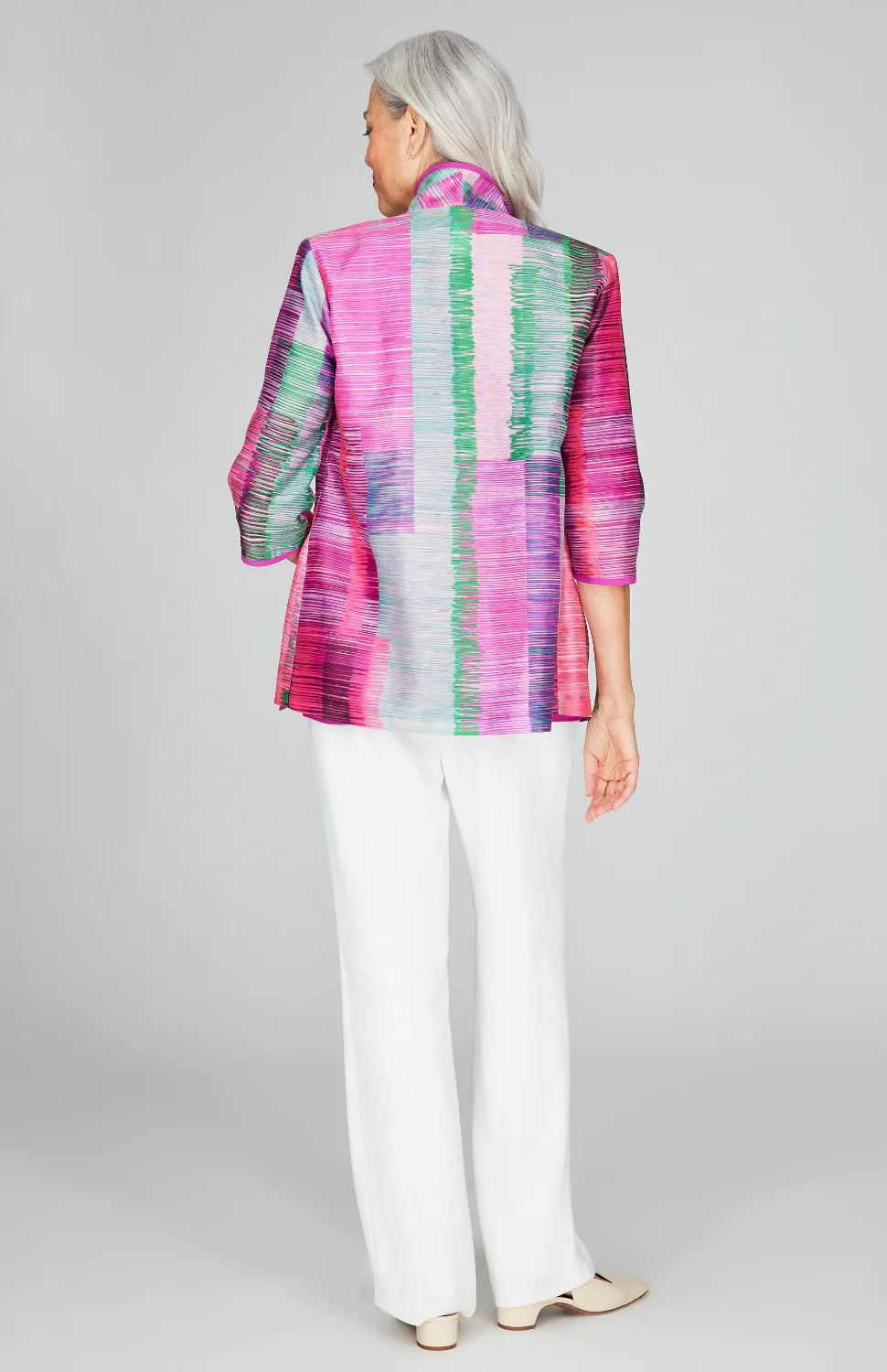 Elevate your wardrobe with this striking Linear Expressionist Organza Shirt Jacket. Featuring a chic open front silhouette and sophisticated high neckline, it combines artistic flair with modern elegance. The vibrant Berry multi colorway adds a bold statement to any ensemble, while the delicate organza fabric brings an ethereal, refined touch. Perfect for layering over basics or wearing as a standalone piece, this jacket transitions seamlessly from day to evening wear. A versatile essential for those who appreciate contemporary design with artistic edge.