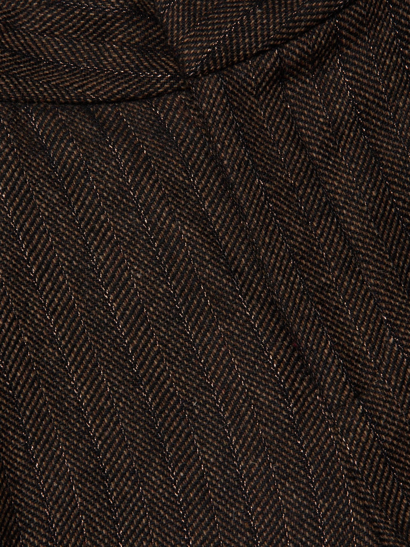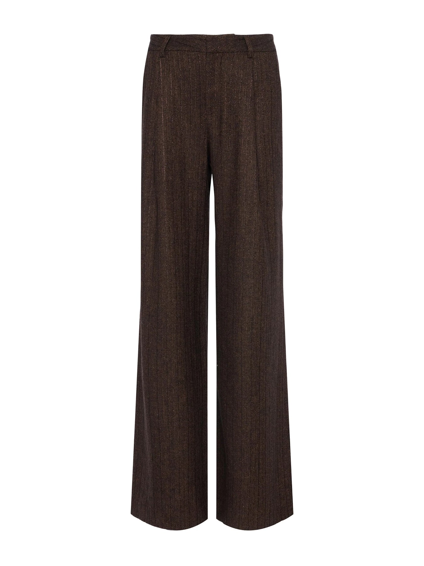 Fitted through the hips and relaxed through the leg, the Allanah is a polished, modern trouser with a flattering fit. Now in recycled wool-blend herringbone with lurex pinstripes.