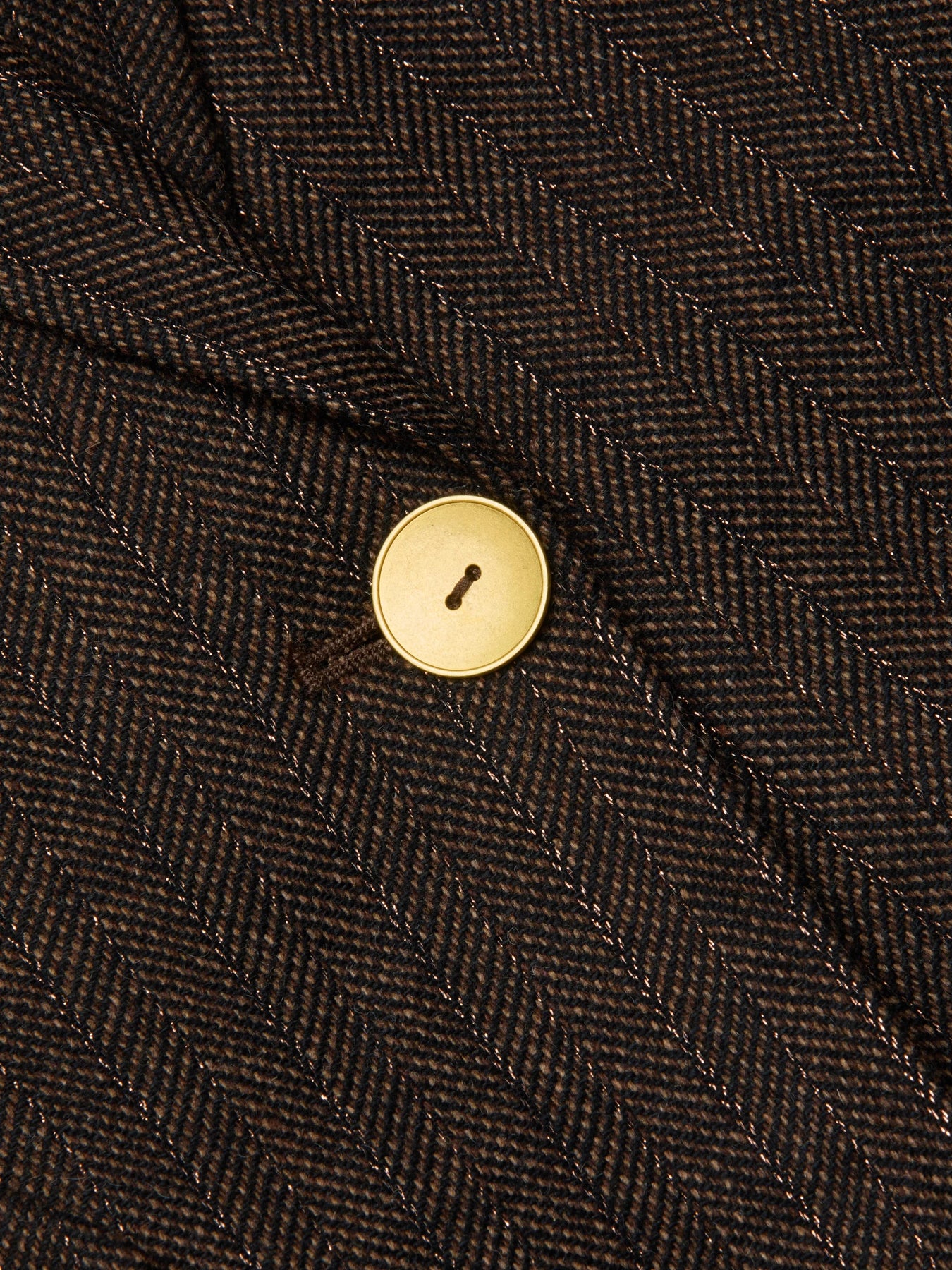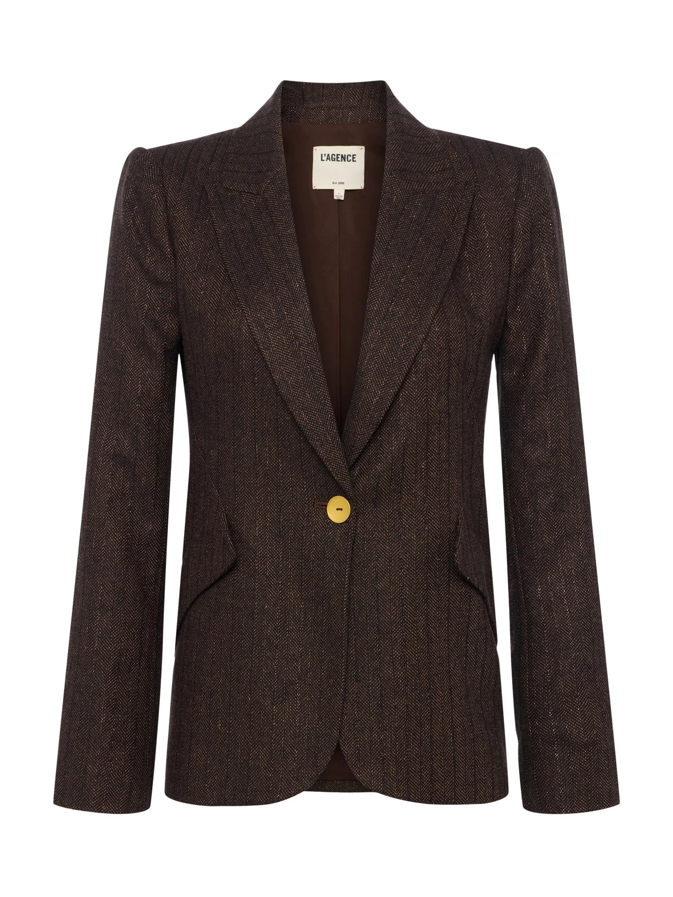 The Chamberlain Blazer is back, this time in a luxurious Italian herringbone with a subtle lurex pinstripe. Expertly tailored in a recycled wool-blend with structured shoulders and a flattering, nipped-in waist, this essential is finished with a single gold-tone button. It pairs effortlessly with denim, trousers, or over a slip dress for a polished day-to-night look.