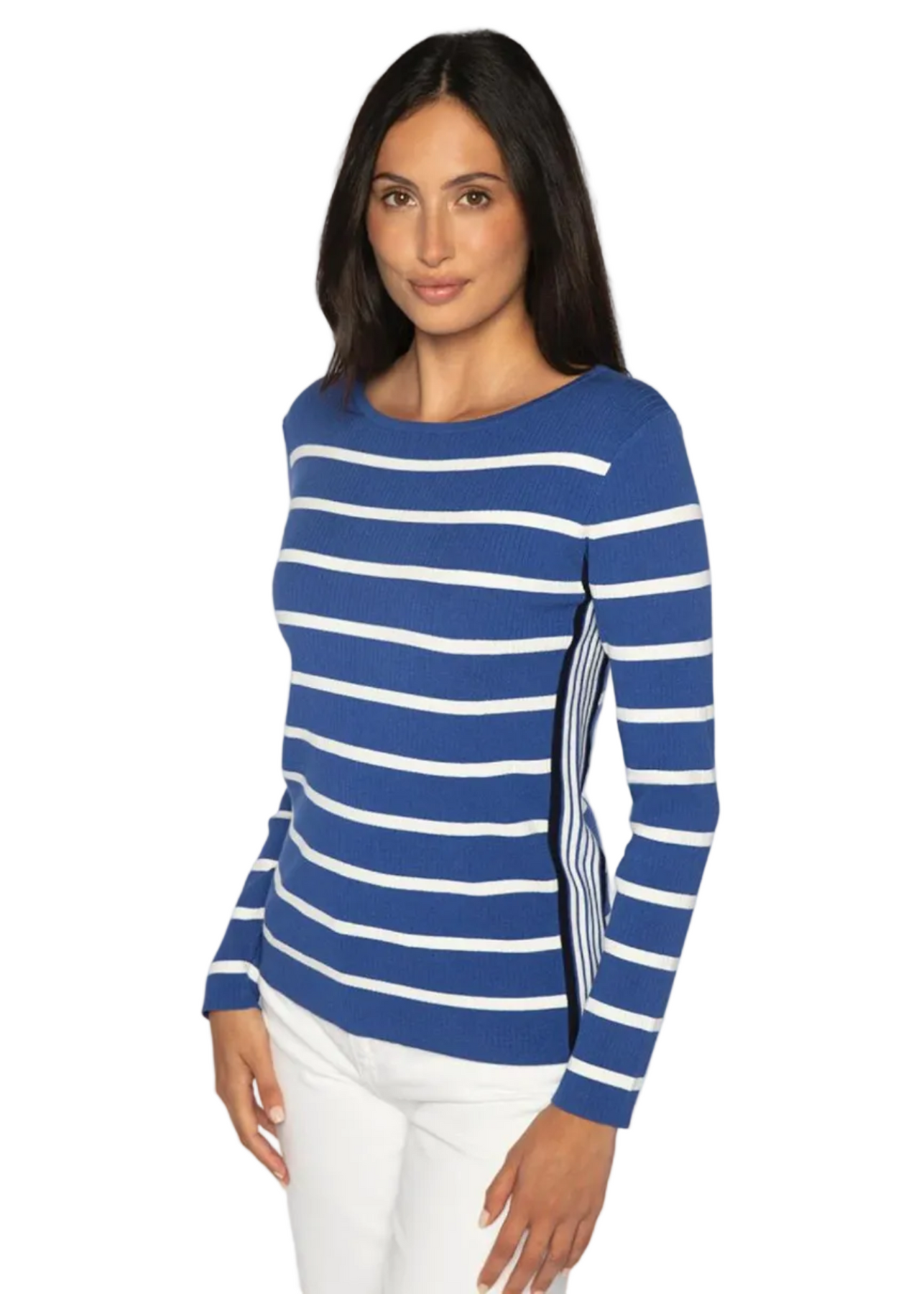 TIPPED RIB STRIPE BOATNECK is designed with a pullover silhouette, boatneck neckline and long sleeves. The ribbed knit construction gives the piece definition. The stripe patterning adds visual interest. Knit from Soft-touch Viscose, the fabric has a fluid drape with a smooth, cool hand.