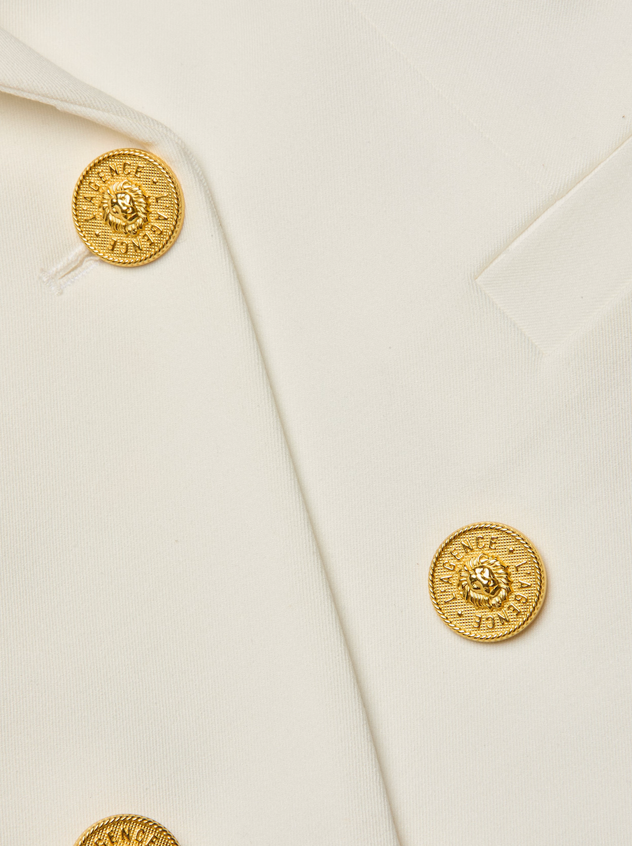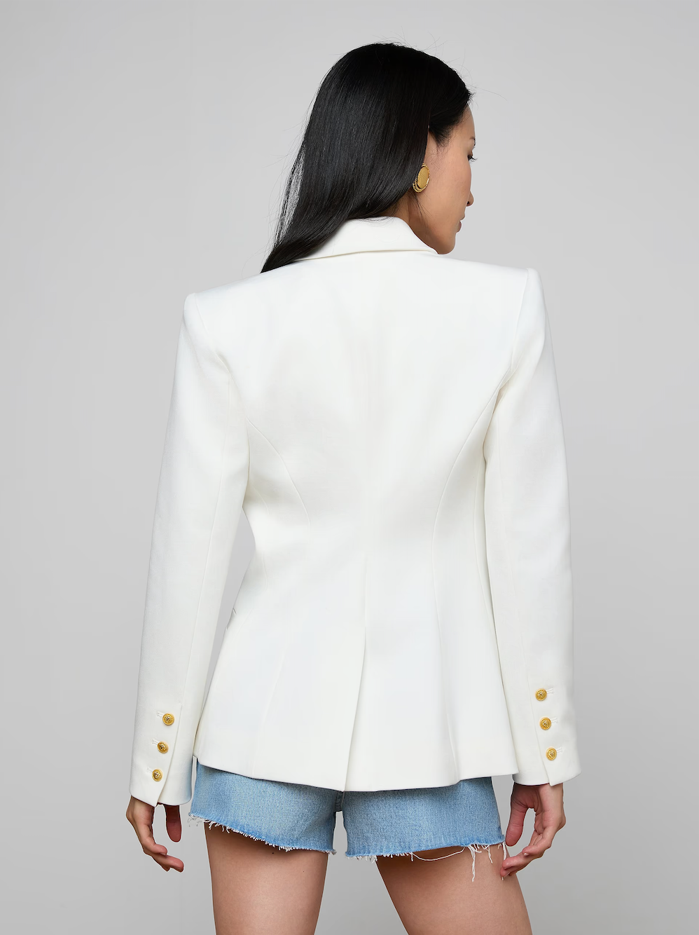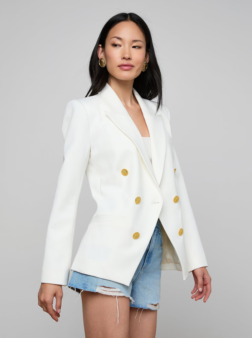 This style was featured in our Spring 2026 NYFW presentation, After Hours. A timeless essential, the Kyomi is our signature double-breasted blazer offered in a longer line, now back in white.