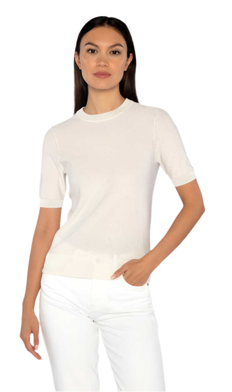 Elevate your wardrobe with this Sequin Short Sleeve Crew. Its classic design is perfect for any occasion, adding an elegant and sophisticated touch to your ensemble. The intricate sequin detailing will make you stand out in a crowd, while the short sleeves allow for a comfortable and stylish fit. Upgrade your look today.