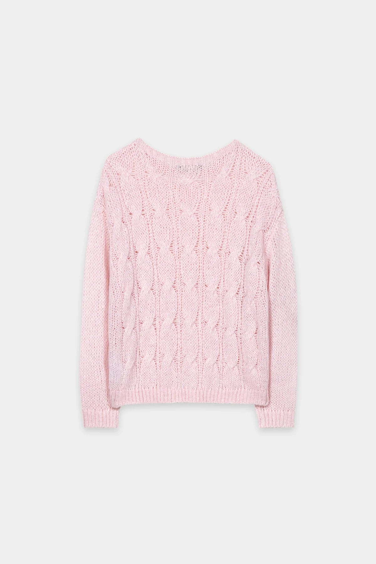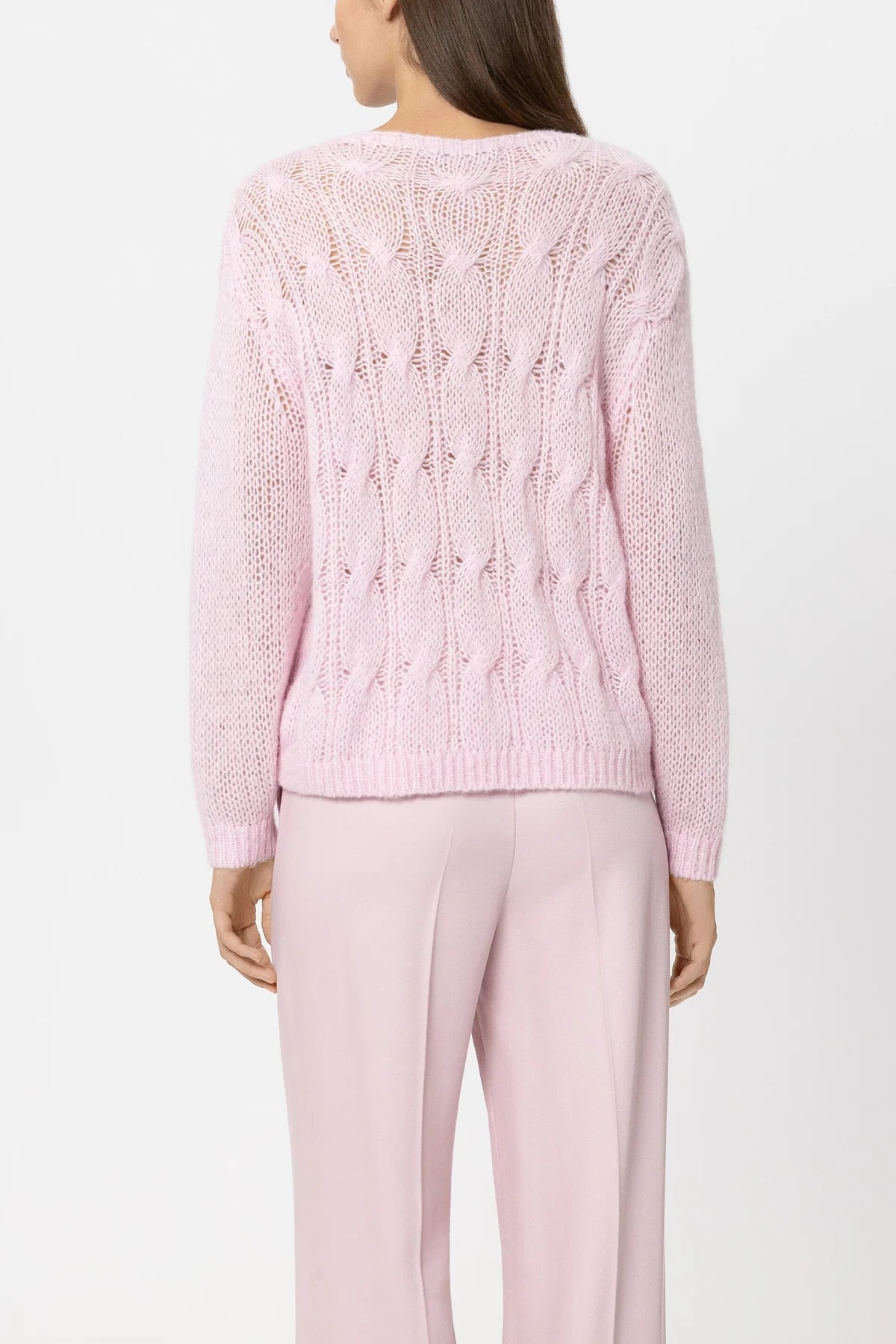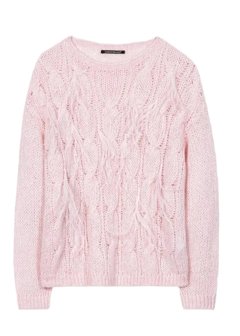 Knitted sweater made from a particularly soft alpaca/wool blend in a light and airy airspun fabrication with a cable-knit pattern and round neckline. The hand-applied feathers create a real wow effect.