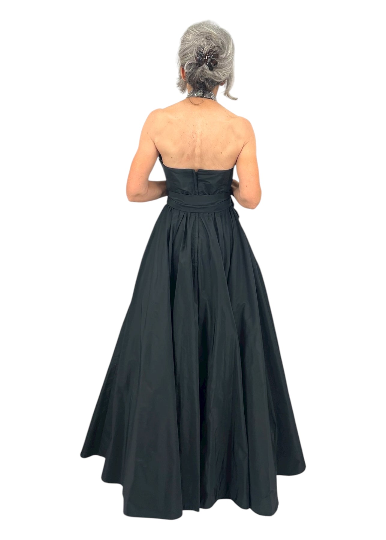 This black T-Neck gown is made from Italian taffeta for a luxurious and elegant look. The addition of crystals in a black yellow diamond gown adds a touch of sparkle and glamour. Perfect for formal occasions, this dress is sure to make a statement with its sophisticated design and high-quality materials.