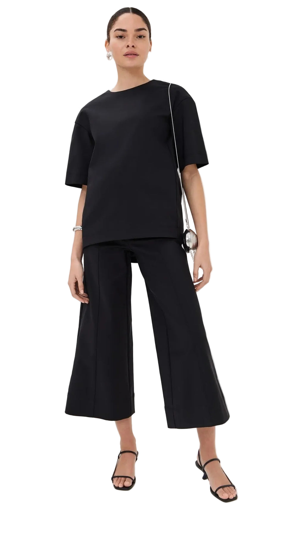 Cut from crisp utility cotton, these pants feature a high waist and wide leg balanced by precise front seams. The silhouette falls with clean structure and ease. Tailored minimalism designed for versatility.