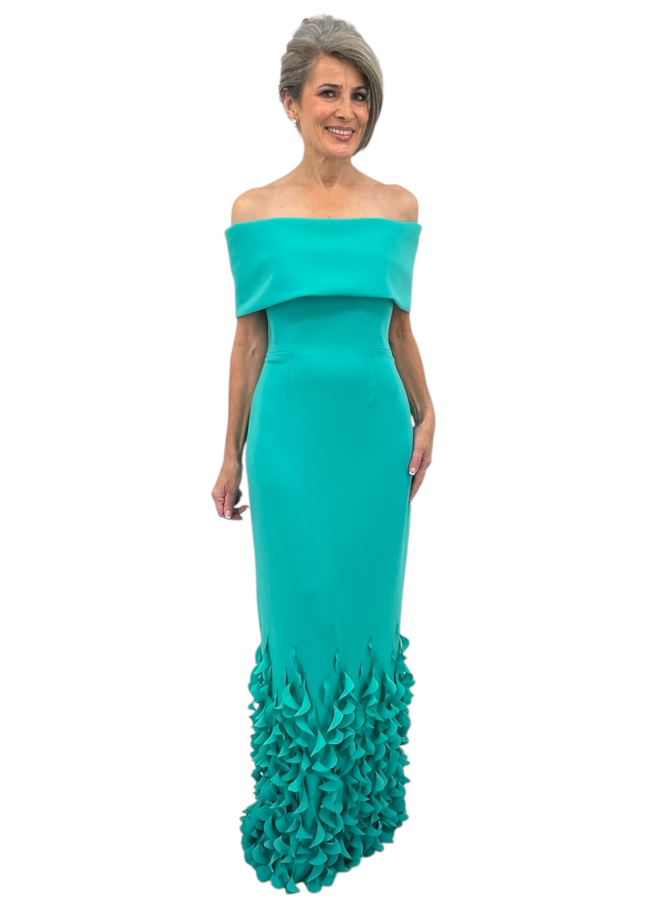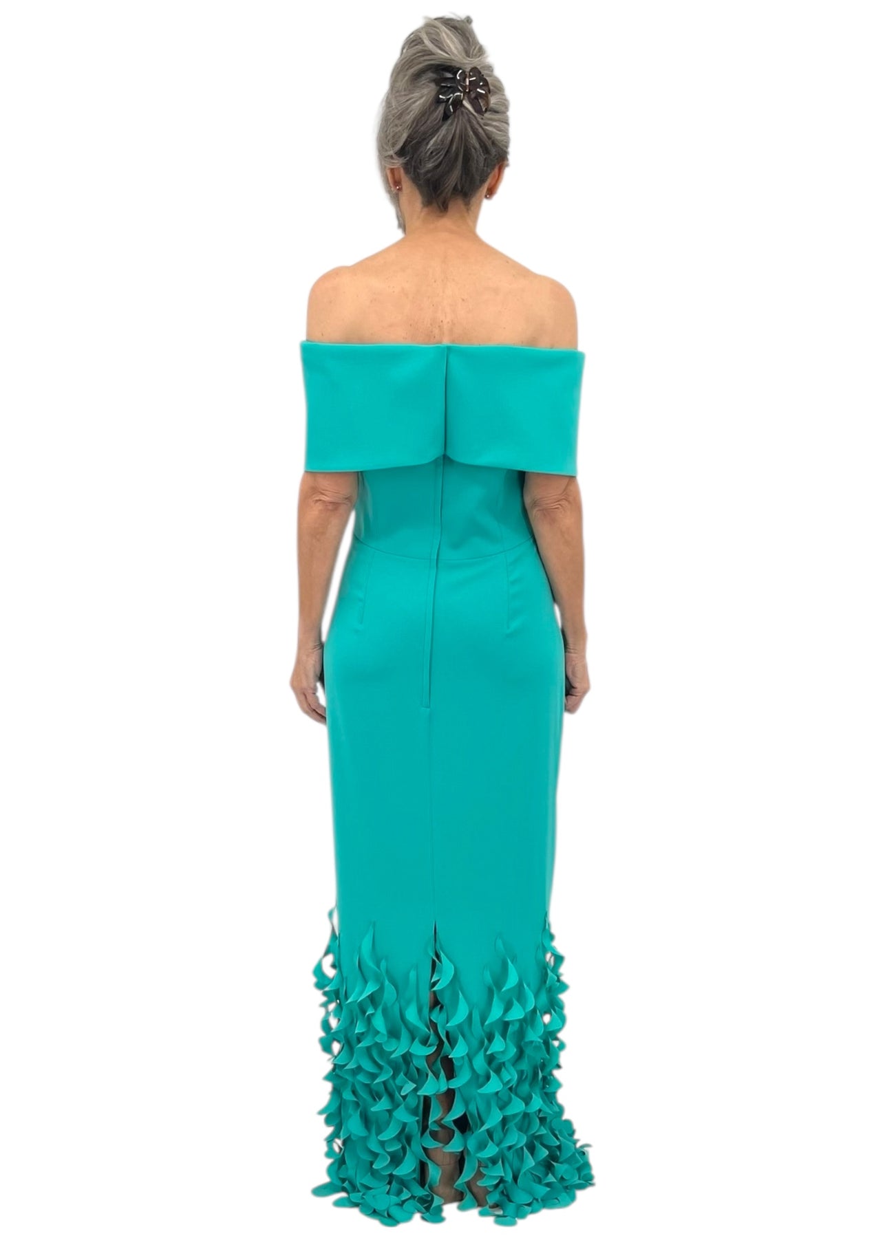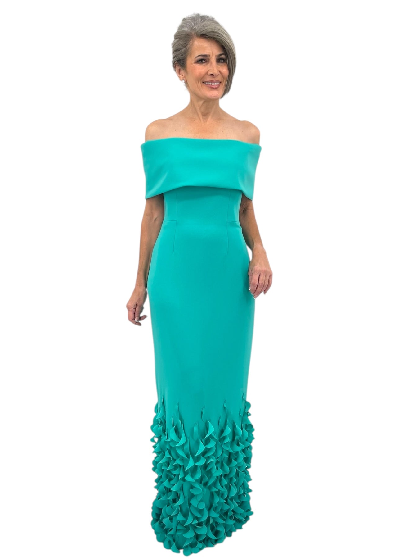 This aquamarine gown commands attention with its architectural off-the-shoulder silhouette and refined roll collar. Spiral laser-cut details cascade along the hemline, creating an intricate interplay of light and shadow that elevates the piece from elegant to editorial. A sophisticated choice for mothers of the bride or groom seeking a statement gown that balances timeless glamour with contemporary design.