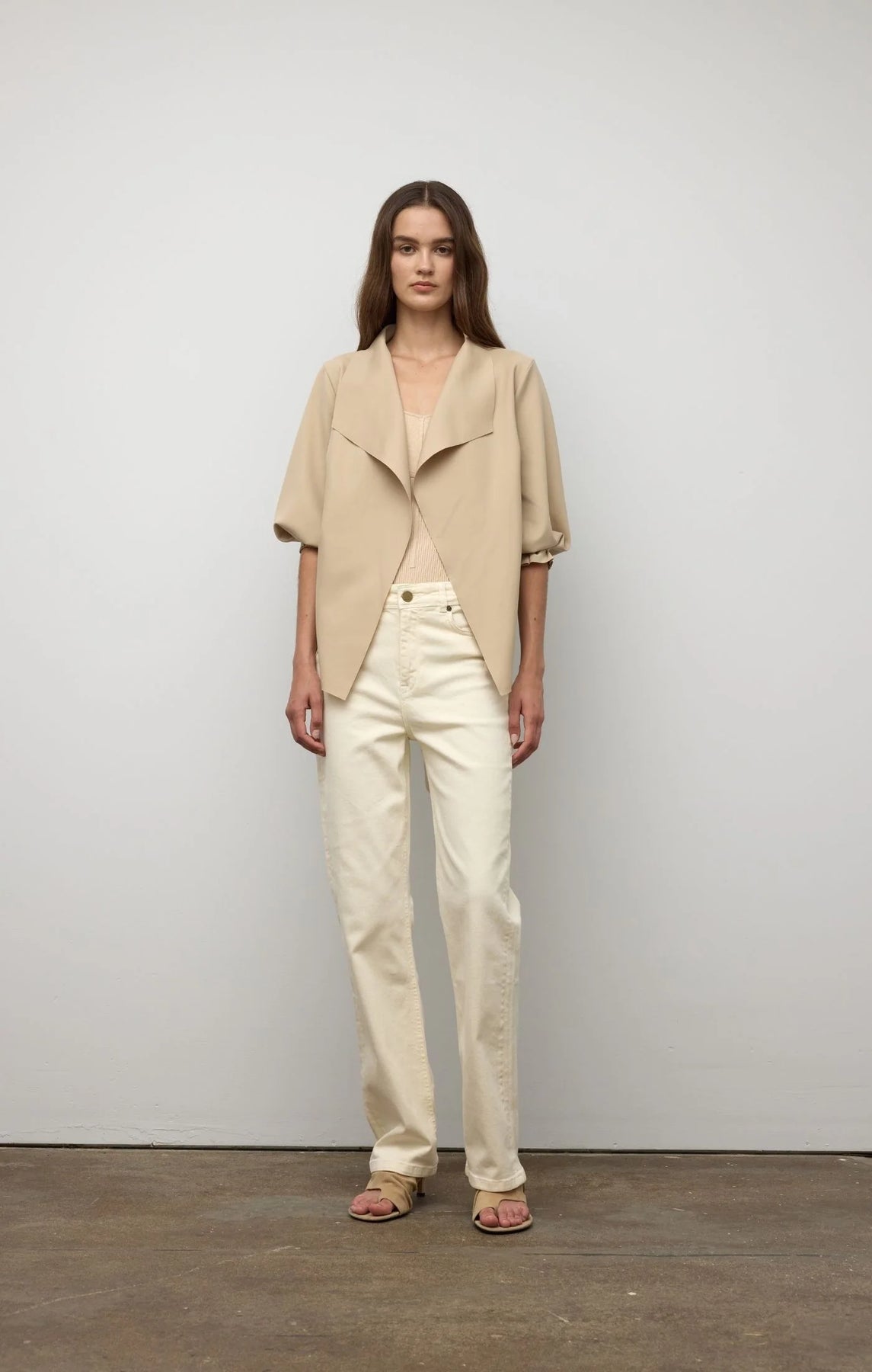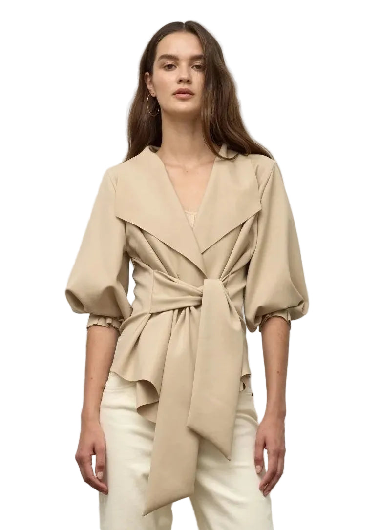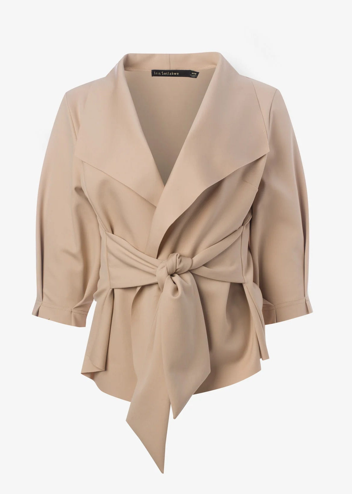This raw-edge belted jacket is crafted from a lightweight, stretchy Japanese scuba fabric. It is easy to maintain and ideal for travel, offering both comfort and structure. The versatile design allows it to be worn in multiple ways: wrapped and tied at the back, styled and belted in the front, or worn open for a relaxed look. Its kimono-inspired silhouette makes it a timeless and adaptable wardrobe piece.