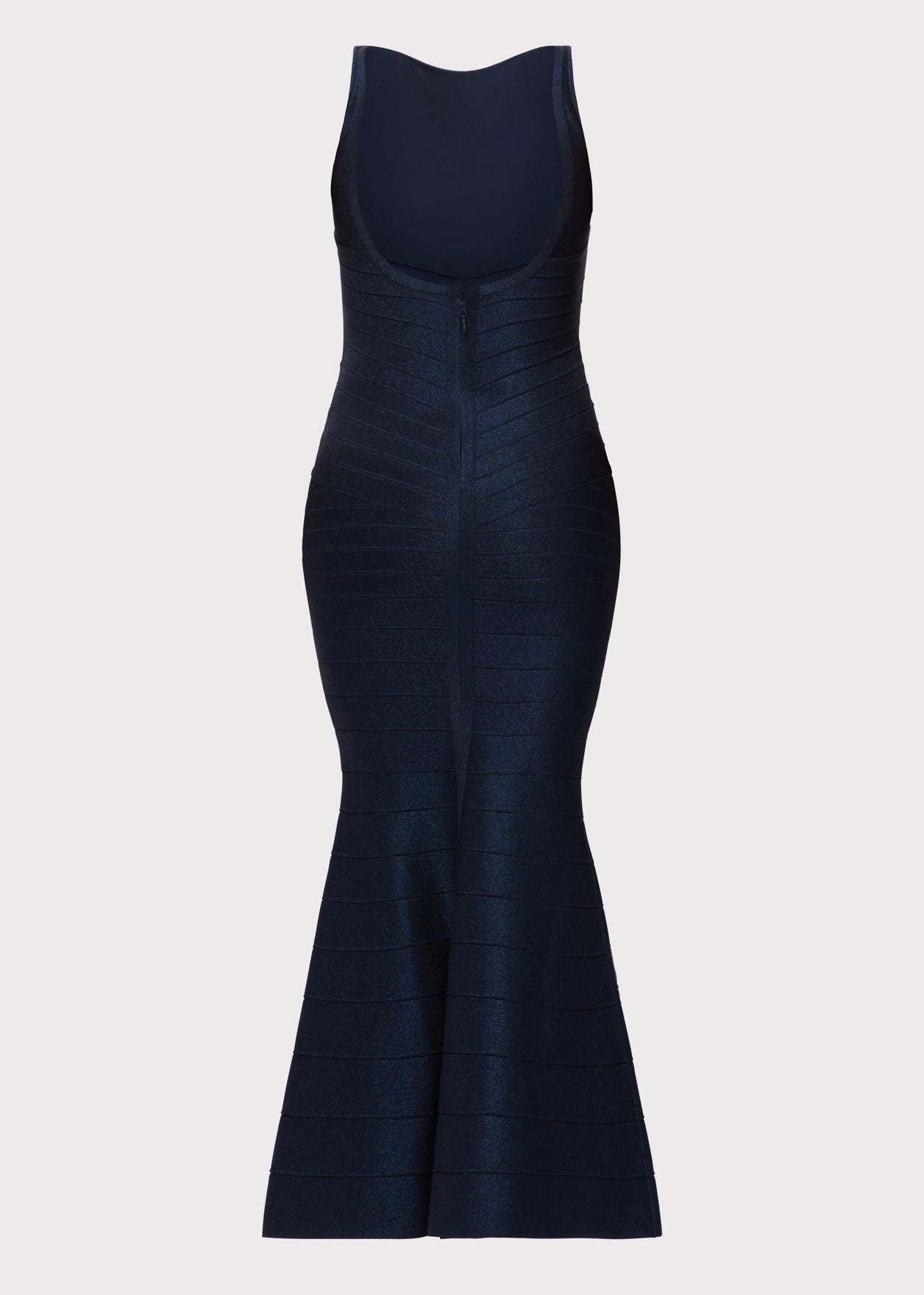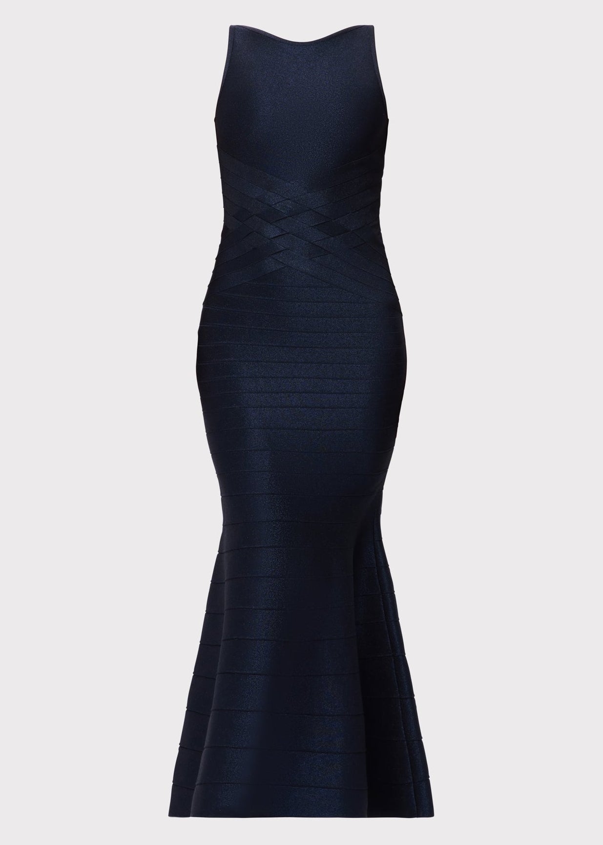 The Lurex Dion Gown, new for Spring '26, is a floor-length silhouette featuring a boat neckline with a low back and mermaid hem. Cut from bandage with a metallic denim effect, it has true bandage weave detailing to define the waist. The gown is finished with a center-back zip.