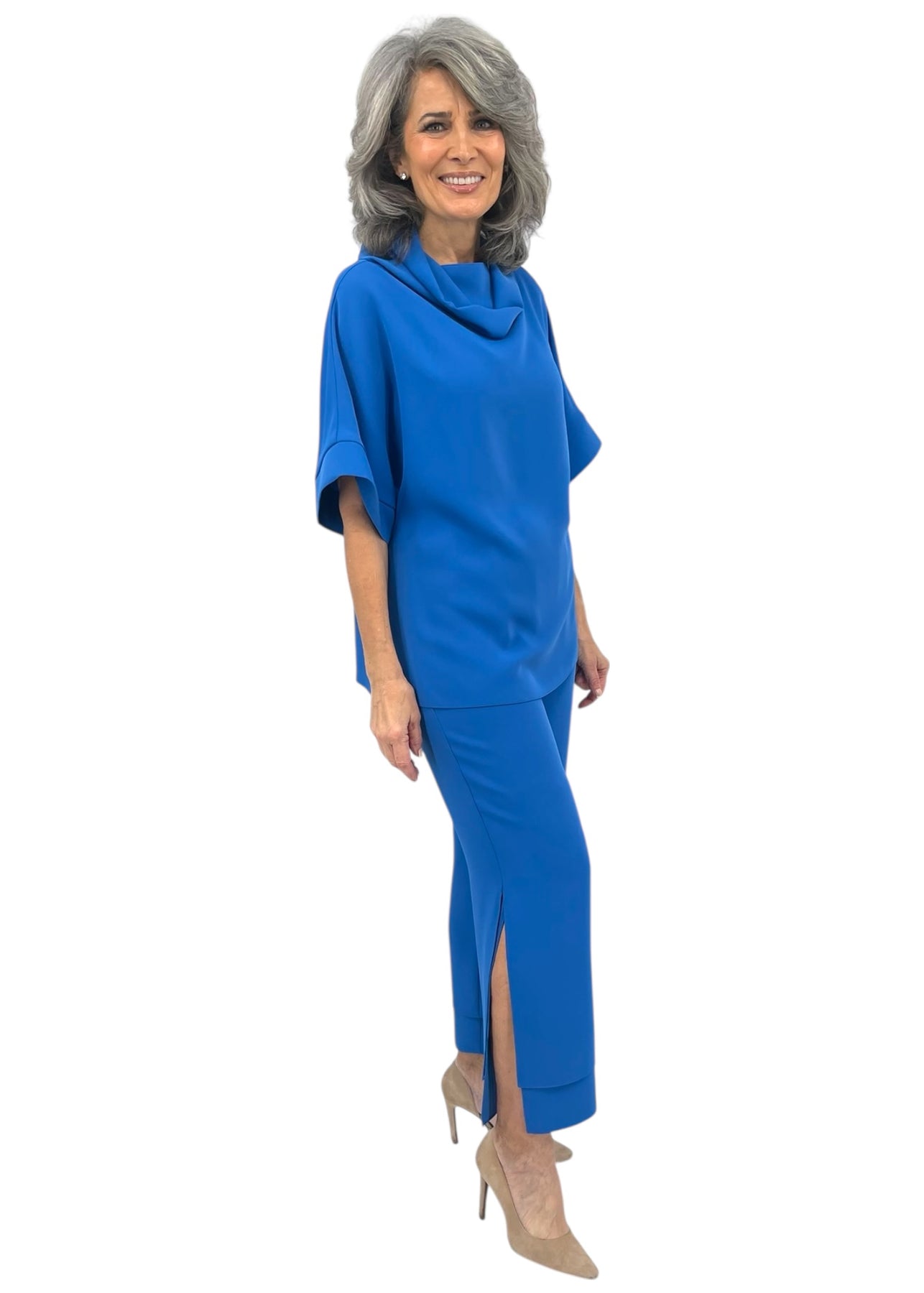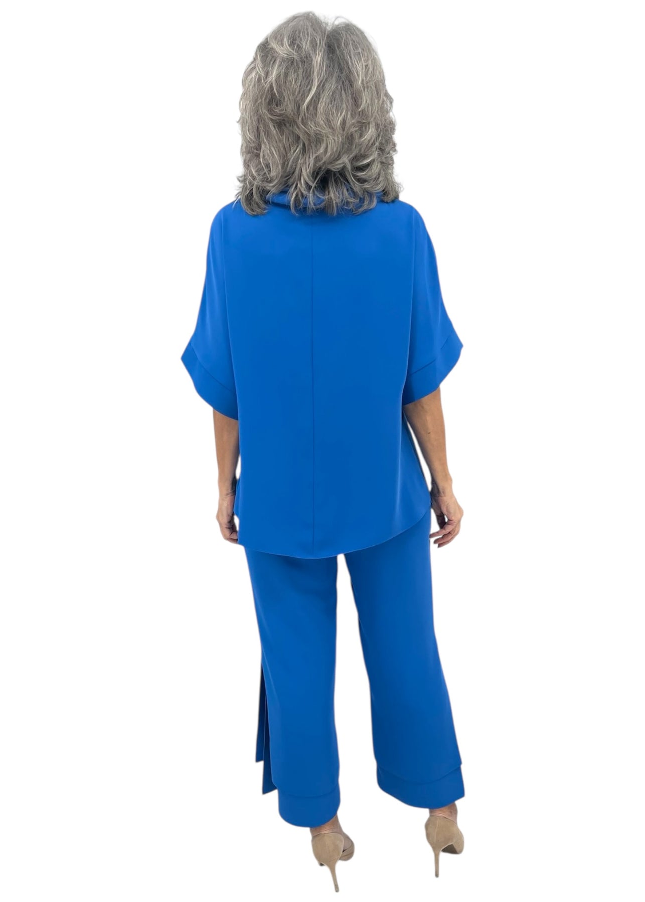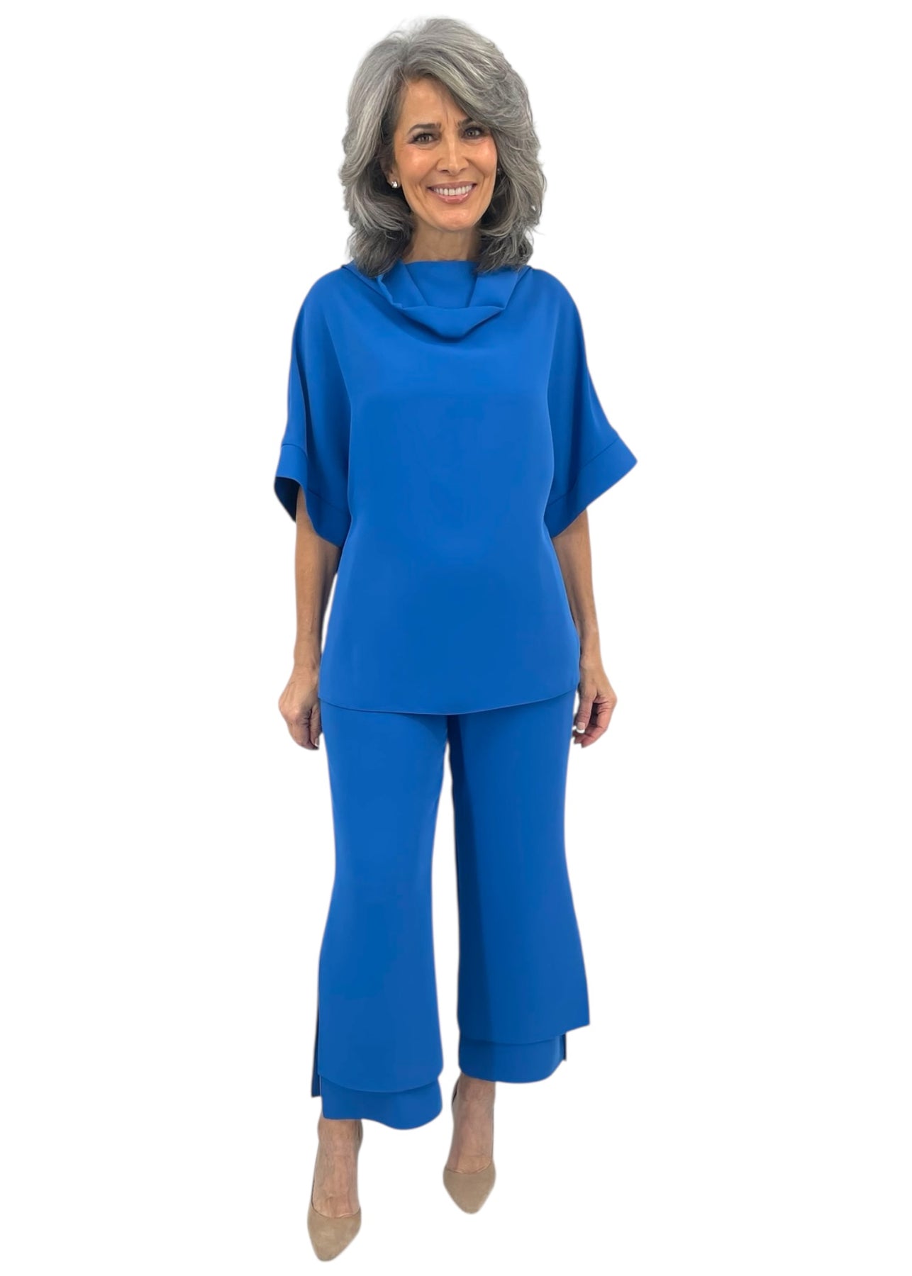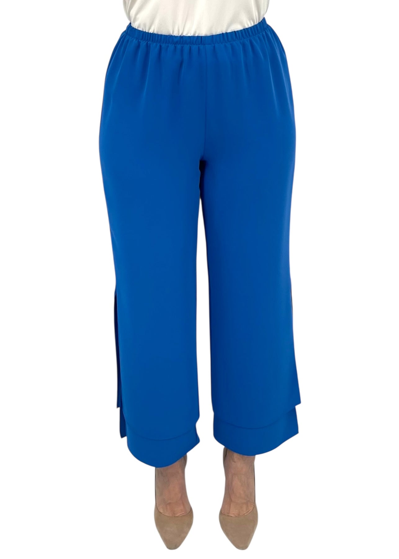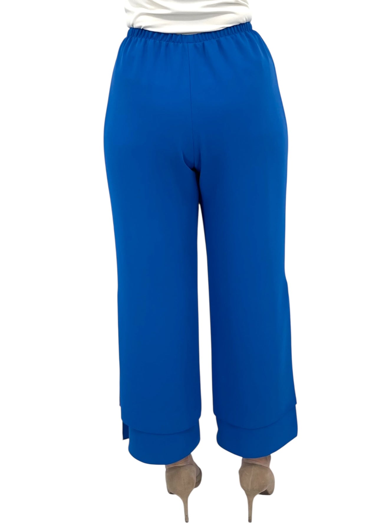 A wide leg pant with our signature double layer detailing. This pant features a simple pull on elastic waistband and side slits for effortless movement.