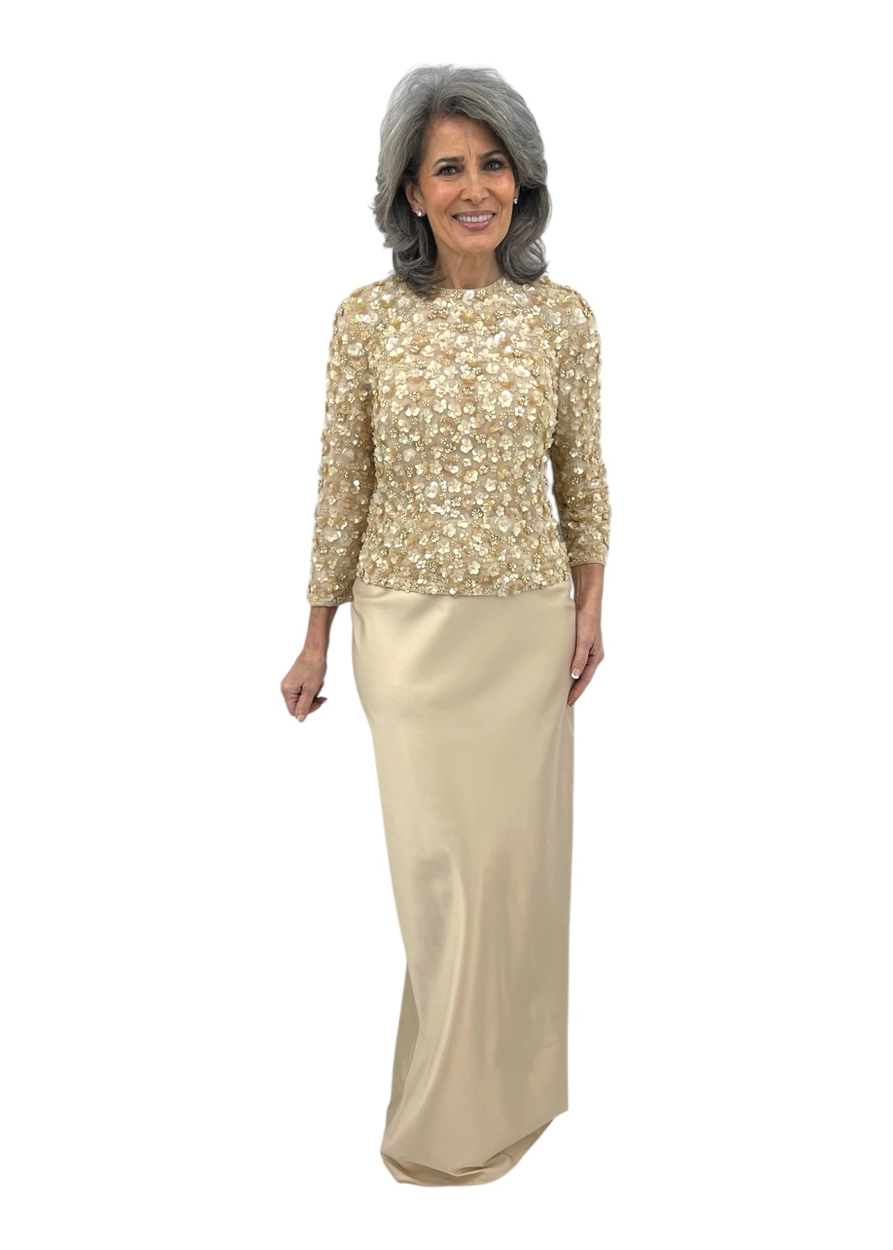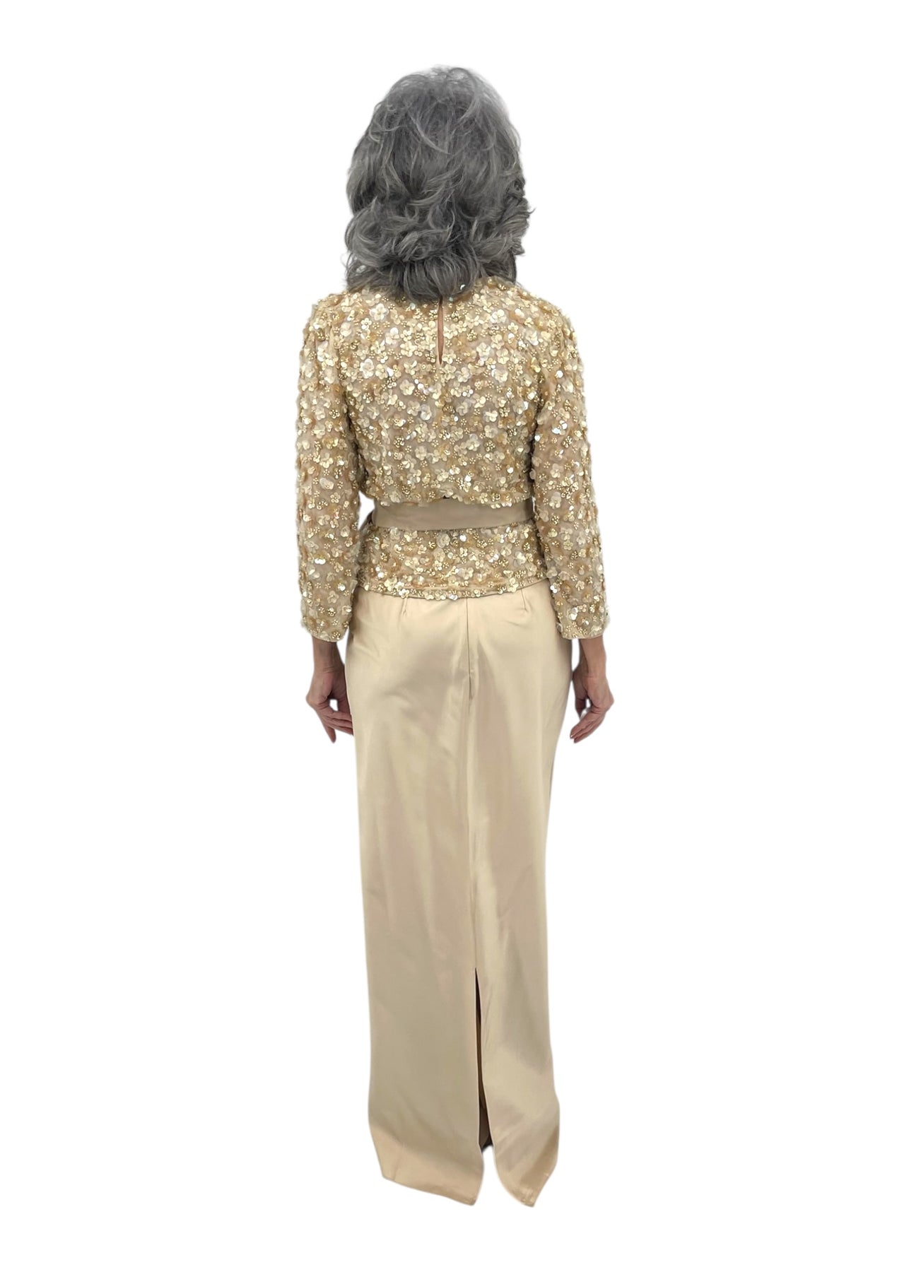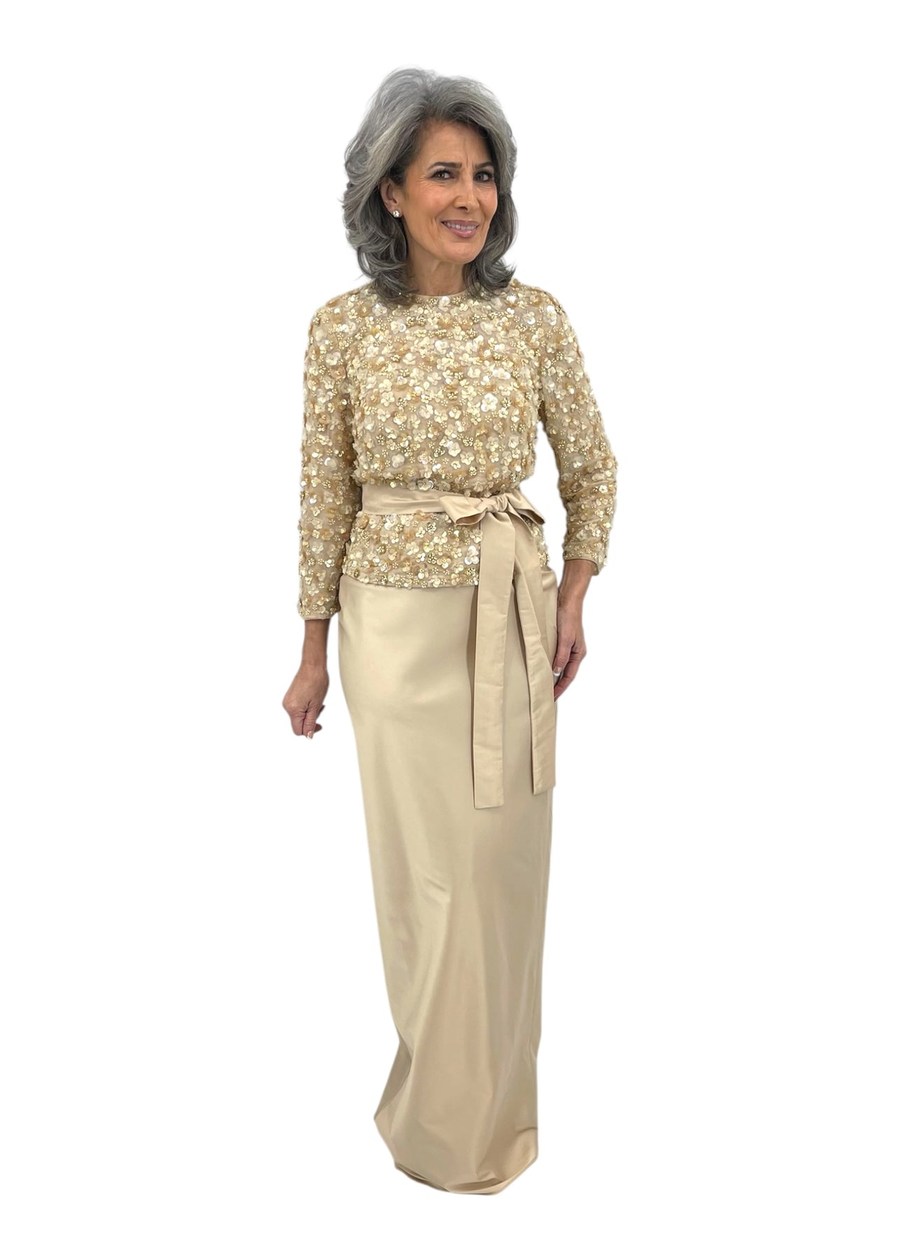 Bias cut taffeta column skirt is sleek and feminine. Perfect color match and compliment to our taffeta and beaded tops. 47" skirt length from true waist, center back slit and zipper. Removable sash to gather your waist.