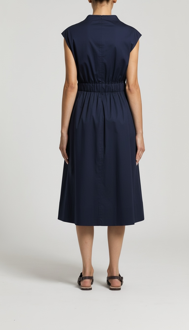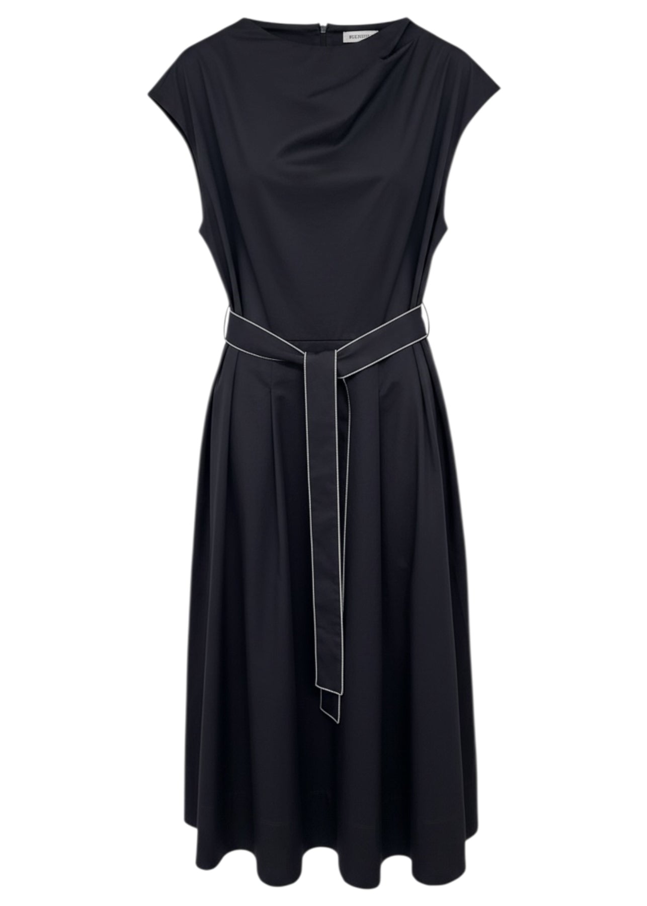 Elevate your wardrobe with this sophisticated boatneck dress in rich navy. The classic boatneck neckline offers timeless elegance, while an embellished belt with ornate edge detailing adds a chic finishing touch. The tie waist creates a flattering silhouette, making this piece perfect for both professional settings and elevated casual occasions. A versatile essential that transitions seamlessly from day to evening.