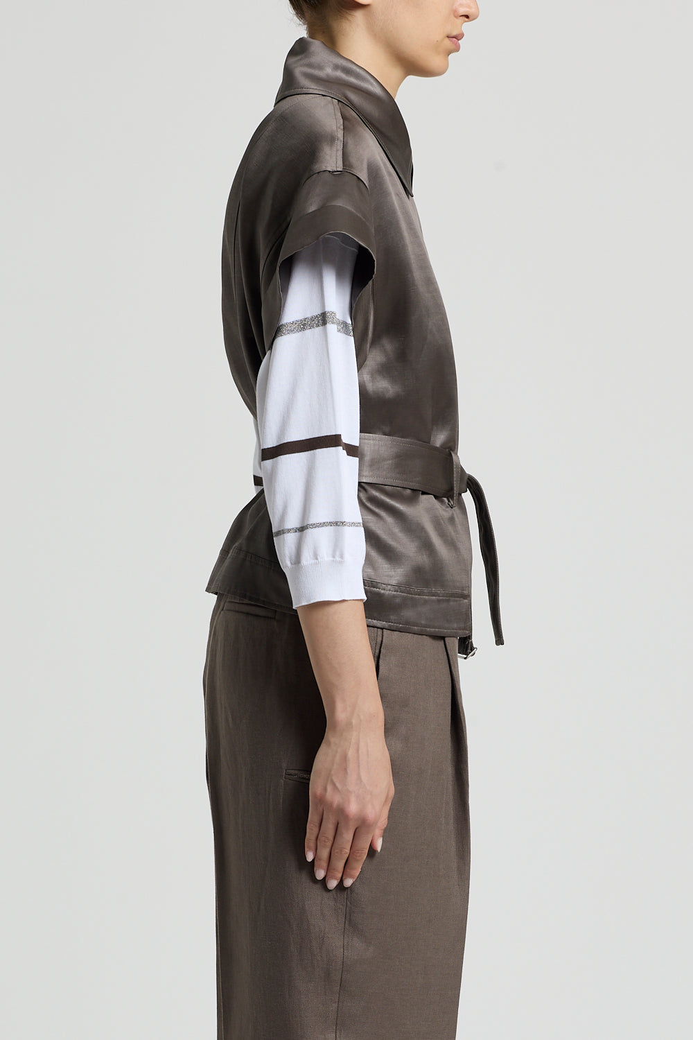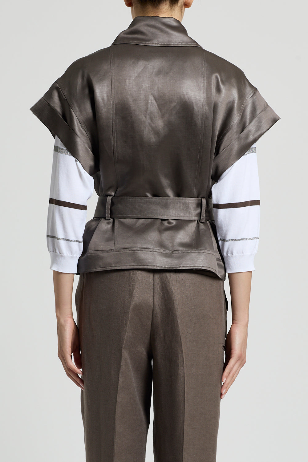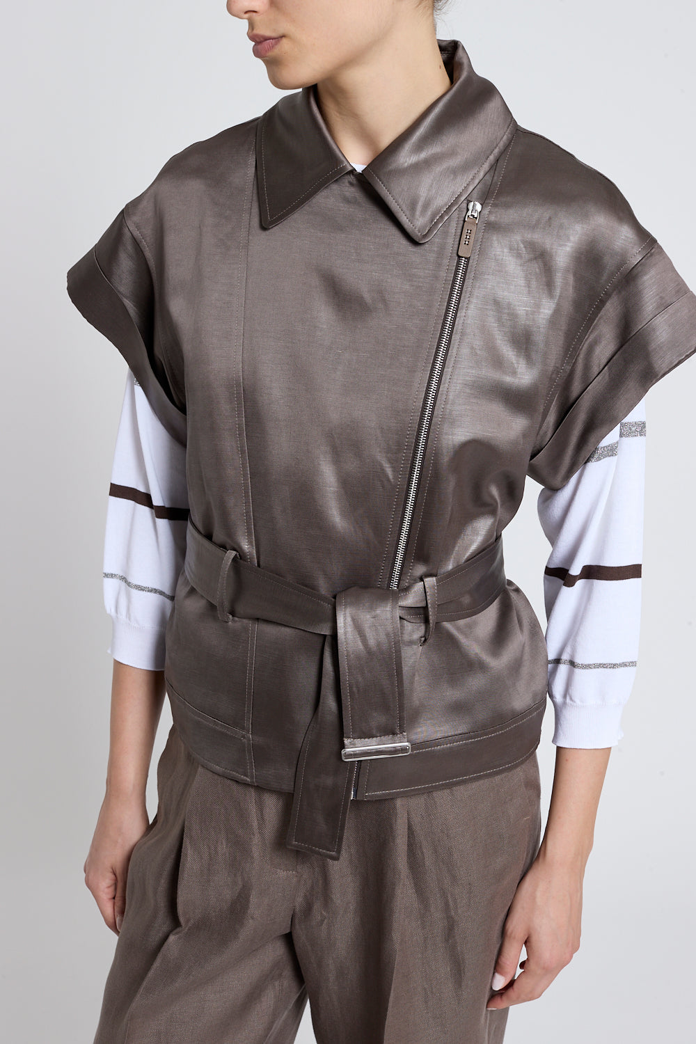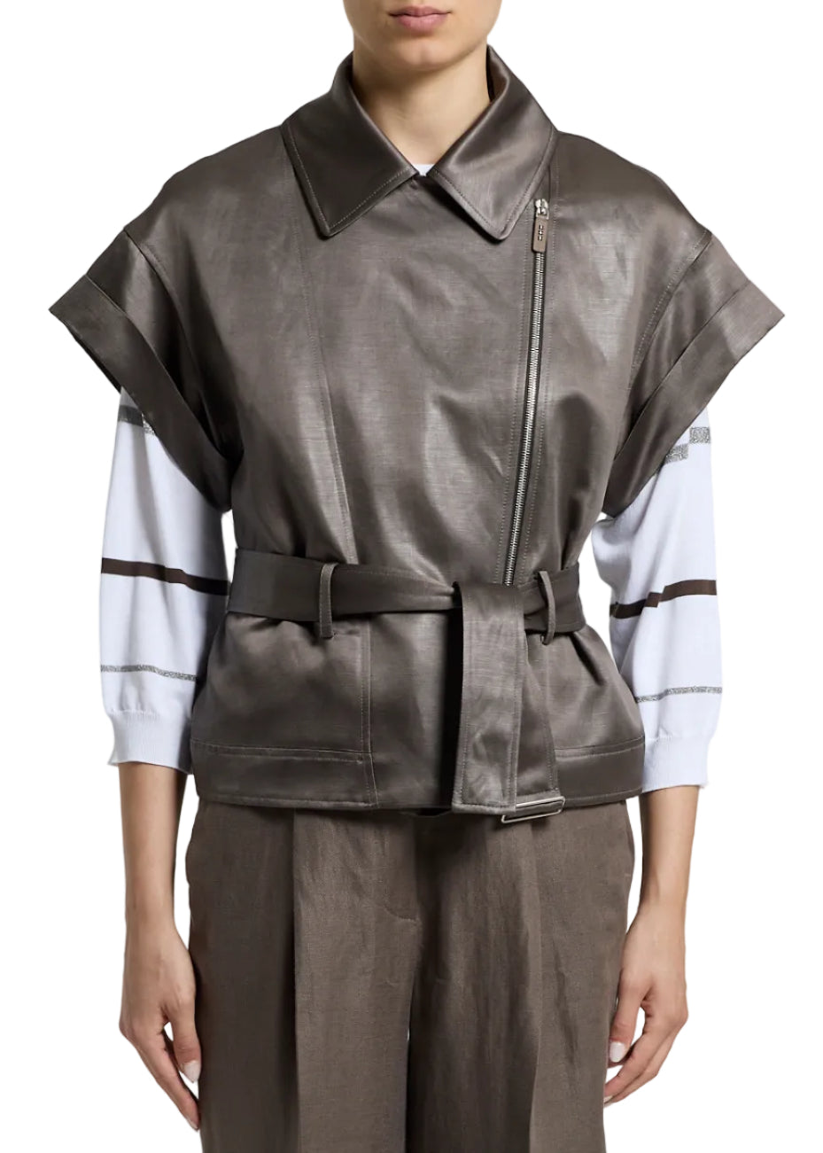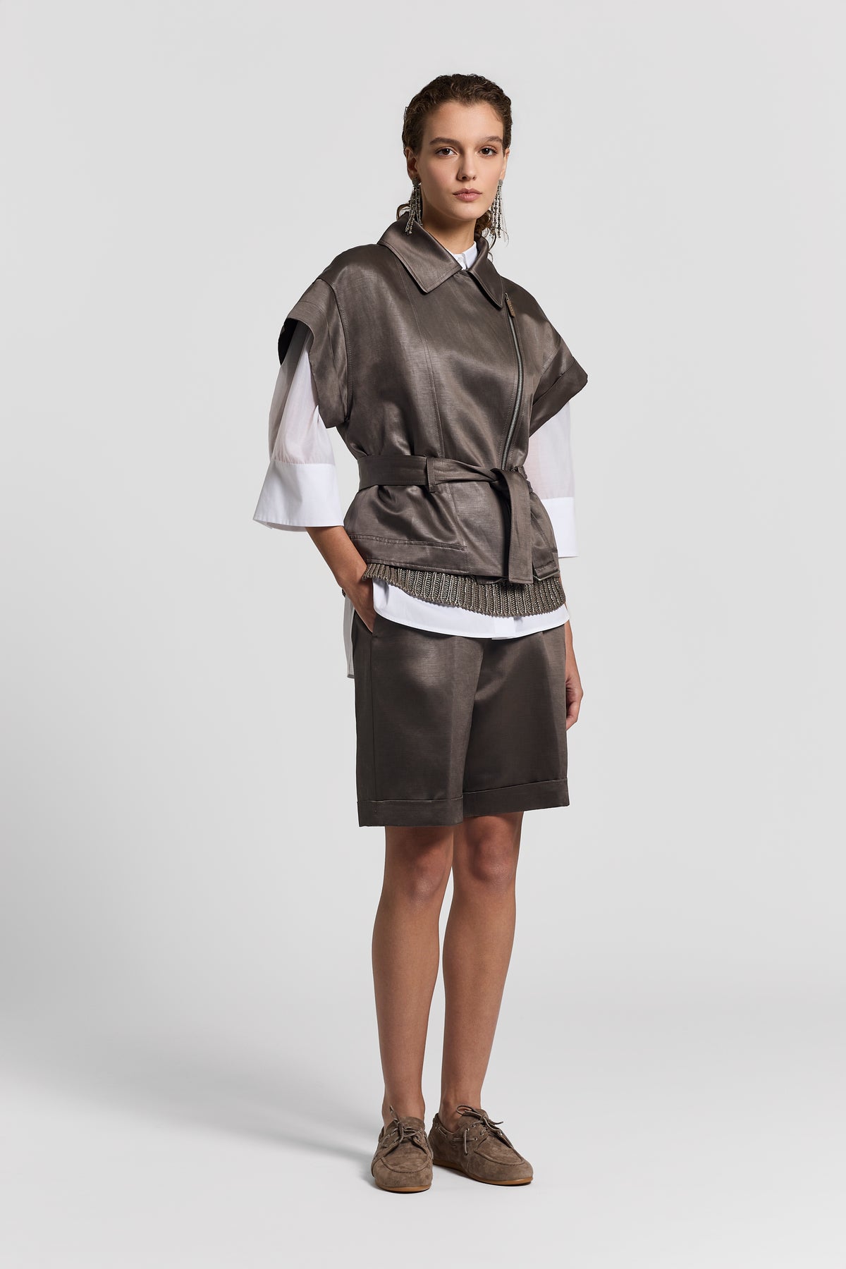 The short-sleeved biker jacket is an iconic piece with bold character, reinterpreted in a contemporary, summary way. The glazed linen-blend fabric stands out for its shiny leather-look appearance, obtained by a finishing treatment that makes the fabric smoother, brighter and more even. The surface maintains the natural slub detailing of the linen that adds authenticity and materiality to the fabric.