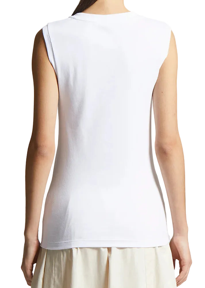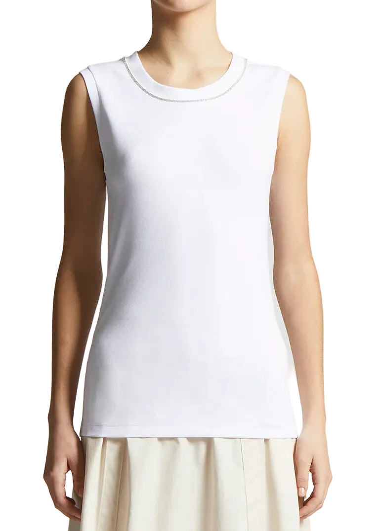This sleeveless micro-rib jersey top wraps the body with softness and comfort, adapting naturally to any look. Perfect under blazers or knitwear, the crewneck is embellished with our iconic Punto Luce detail, which adds a discreet and sparkly detail that is distinctive of Peserico style.