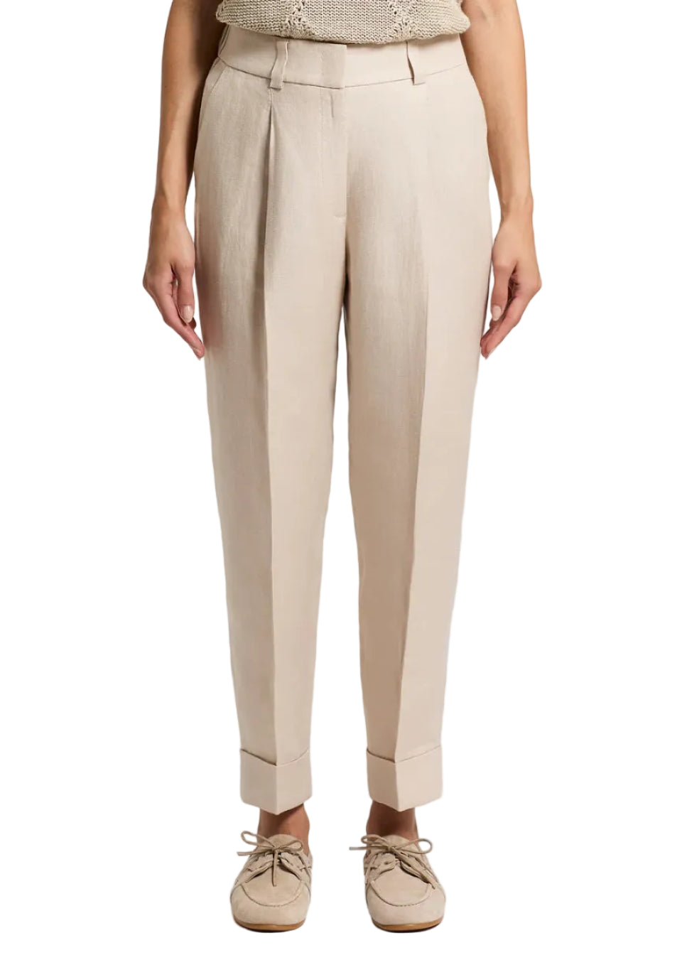 The darted trousers feature an essential line, defined by Punto Luce detailing on the sides, an accent that adds identity to the piece. The slim fit allows it to be worn paired with shirts, tops or blazer, always maintaining a balanced silhouette. Made from pure linen gabardine, the garment merges structure and lightness, characteristics that make these trousers a versatile element.